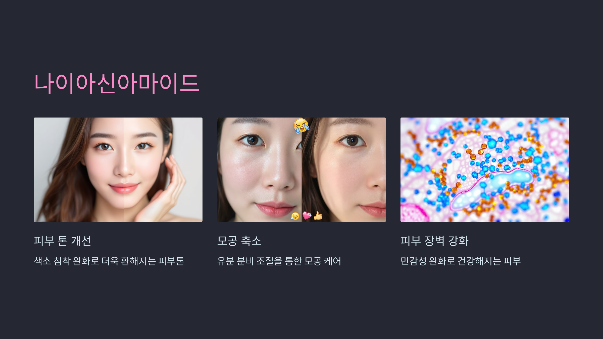 나이아신아마이드는 피부 진정, 모공 축소, 색소 침착 개선에 효과적인 비타민 B3 유도체입니다. 모든 피부 타입에 적합합니다.