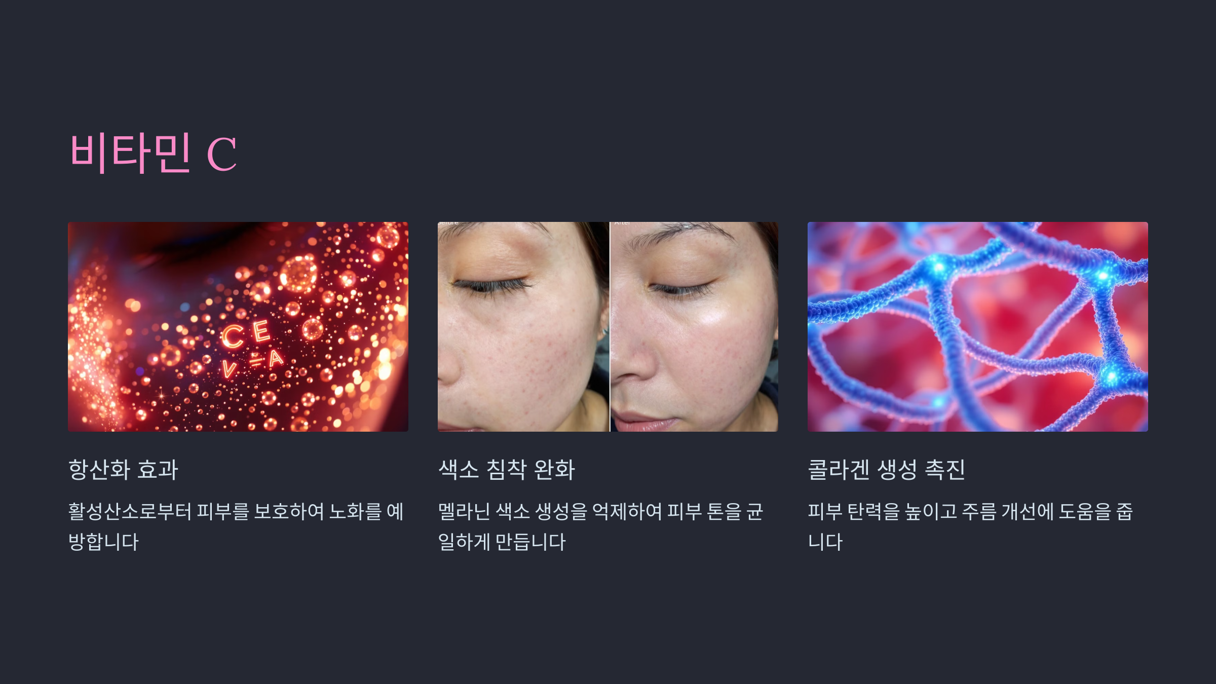 비타민 C는 강력한 항산화제로, 피부를 밝게 하고 콜라겐 생성을 촉진합니다. 자외선으로 인한 피부 손상을 줄이는 데 도움을 줍니다.