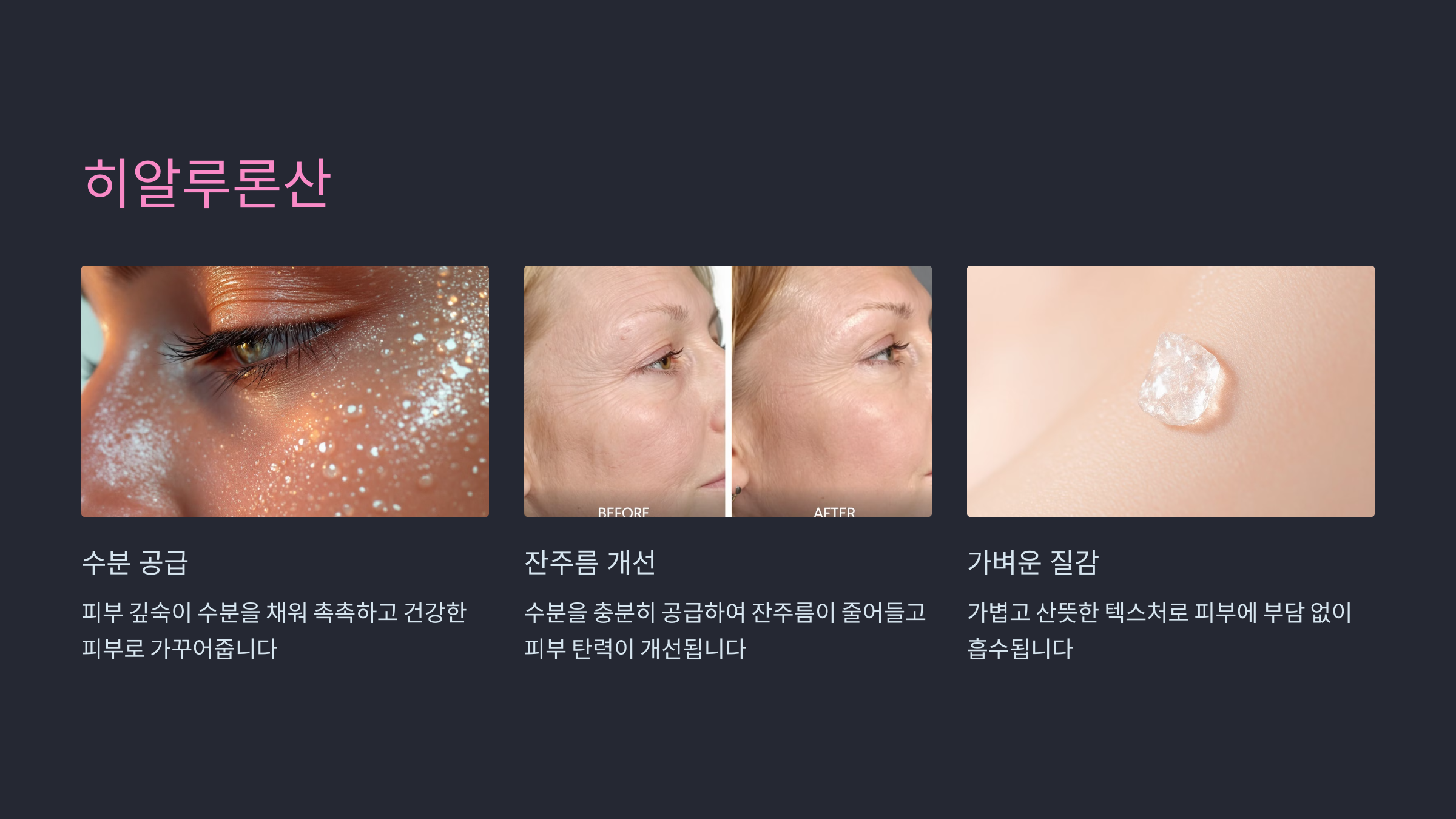 히알루론산은 뛰어난 보습력을 자랑하며, 피부에 수분을 공급해 탄력과 윤기를 더합니다. 모든 피부 타입에 적합합니다.
