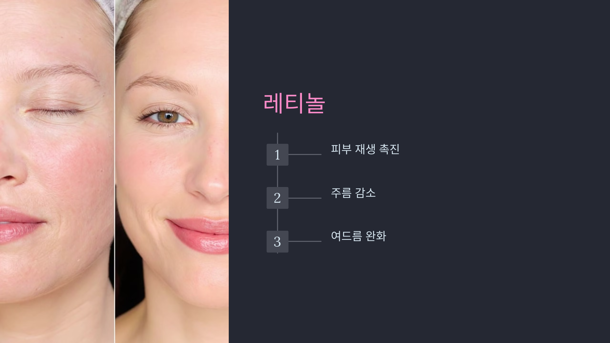 레티놀은 비타민 A의 유도체로, 피부 재생과 여드름 개선에 탁월한 효과를 보입니다. 또한 주름 감소와 탄력 개선에도 도움을 줍니다.