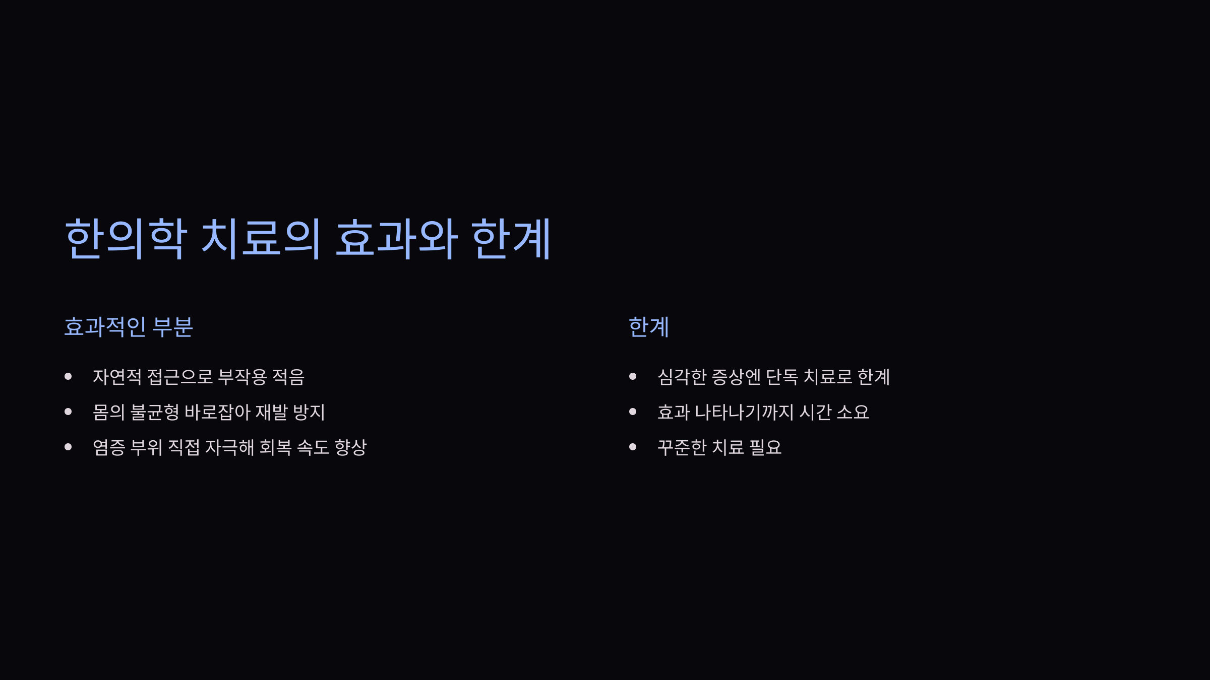 - 효과가 나타나기까지 시간이 걸릴 수 있으며, 꾸준한 치료가 필요합니다.