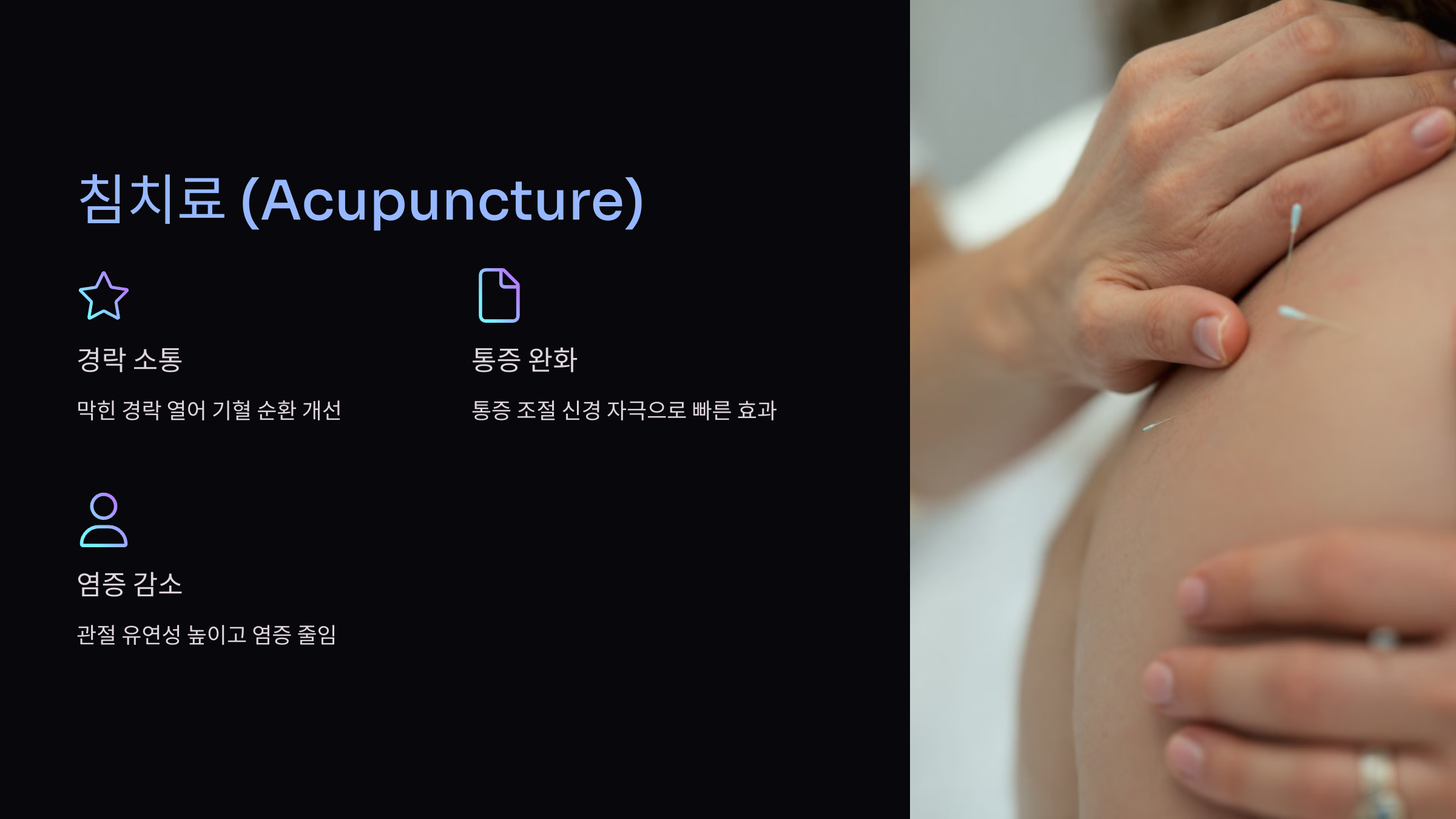 어깨와 관련된 주요 혈자리(肩髃, 肩井, 天宗 등)에 침을 놓습니다. - 주요 장점:
