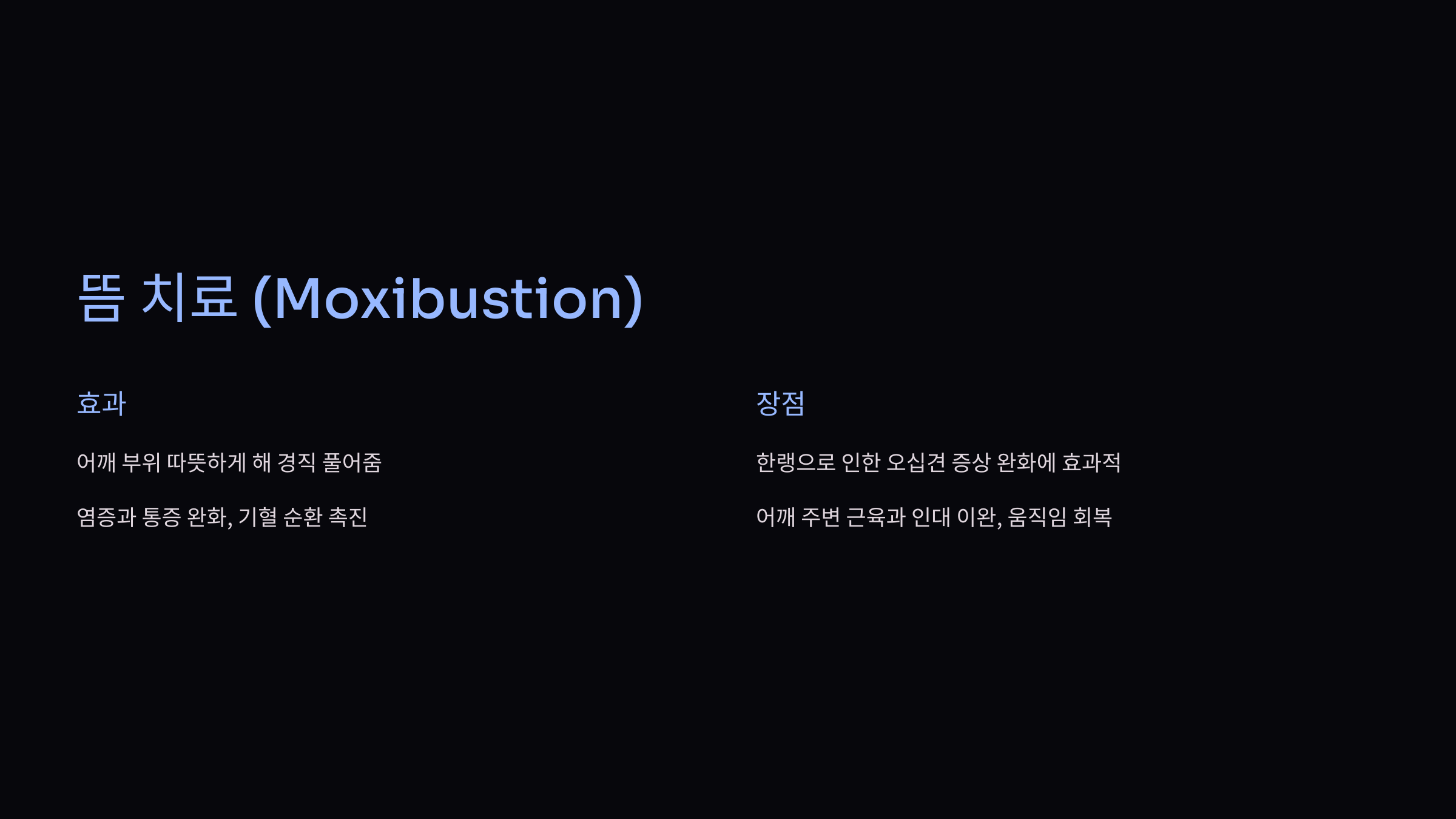 뜸은 어깨 부위를 따뜻하게 해 경직된 관절을 풀어주고, 염증과 통증을 완화합니다. - 치료 과정: