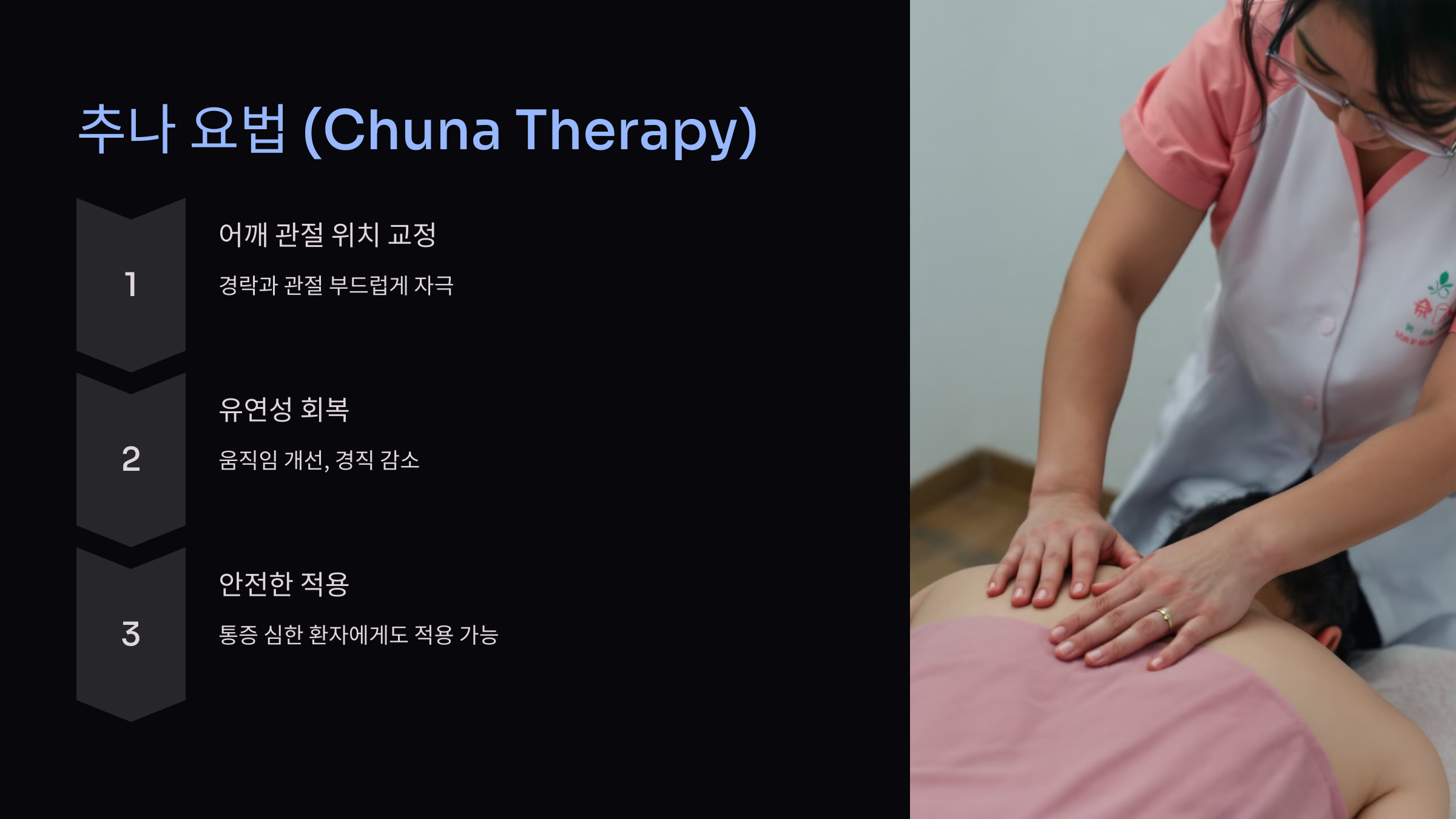 한방 도수치료의 일종으로, 어깨 관절의 위치를 교정하고 유연성을 회복시킵니다. - 치료 과정: