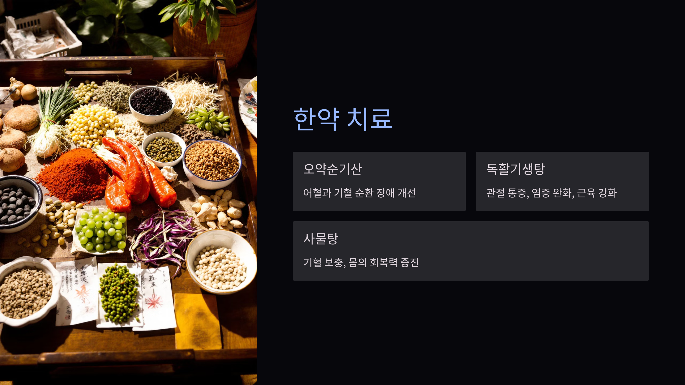 체내 염증을 줄이고, 간과 신장을 강화해 관절과 근육의 건강을 회복시킵니다. - 주요 한약 처방: