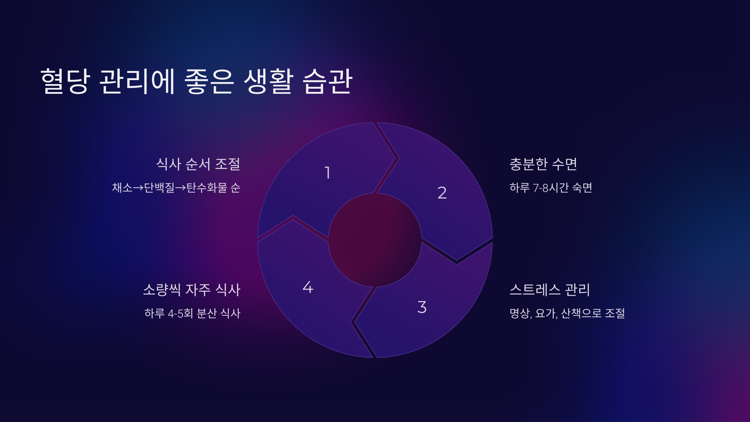 1. **식사 순서 조절**: 채소 → 단백질 → 탄수화물 순으로 먹으면 혈당이 천천히 오르게 돼요. 탄수화물을 먼저 먹으면 혈당이 급격히 상승할 가능성이 높아지니 주의해야 해요.