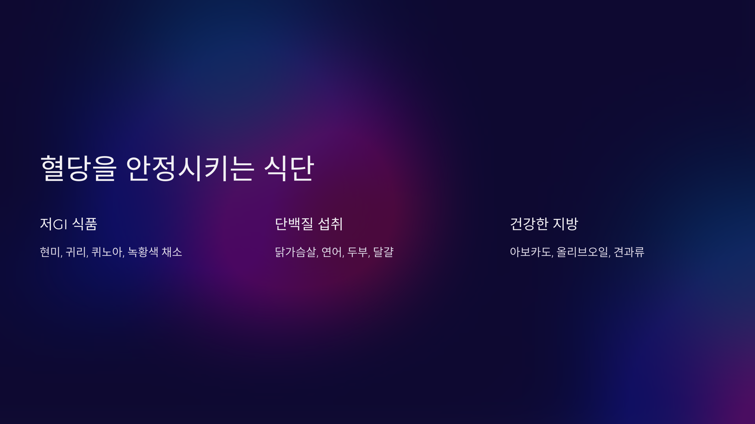 혈당을 안정적으로 유지하기 위해서는 GI(당 지수)가 낮은 음식과 GL(당 부하 지수)이 낮은 음식을 중심으로 식단을 구성하는 것이 좋아요. 또한 단백질과 건강한 지방을 적절히 섭취하면 혈당이 급격하게 상승하는 것을 방지할 수 있어요.