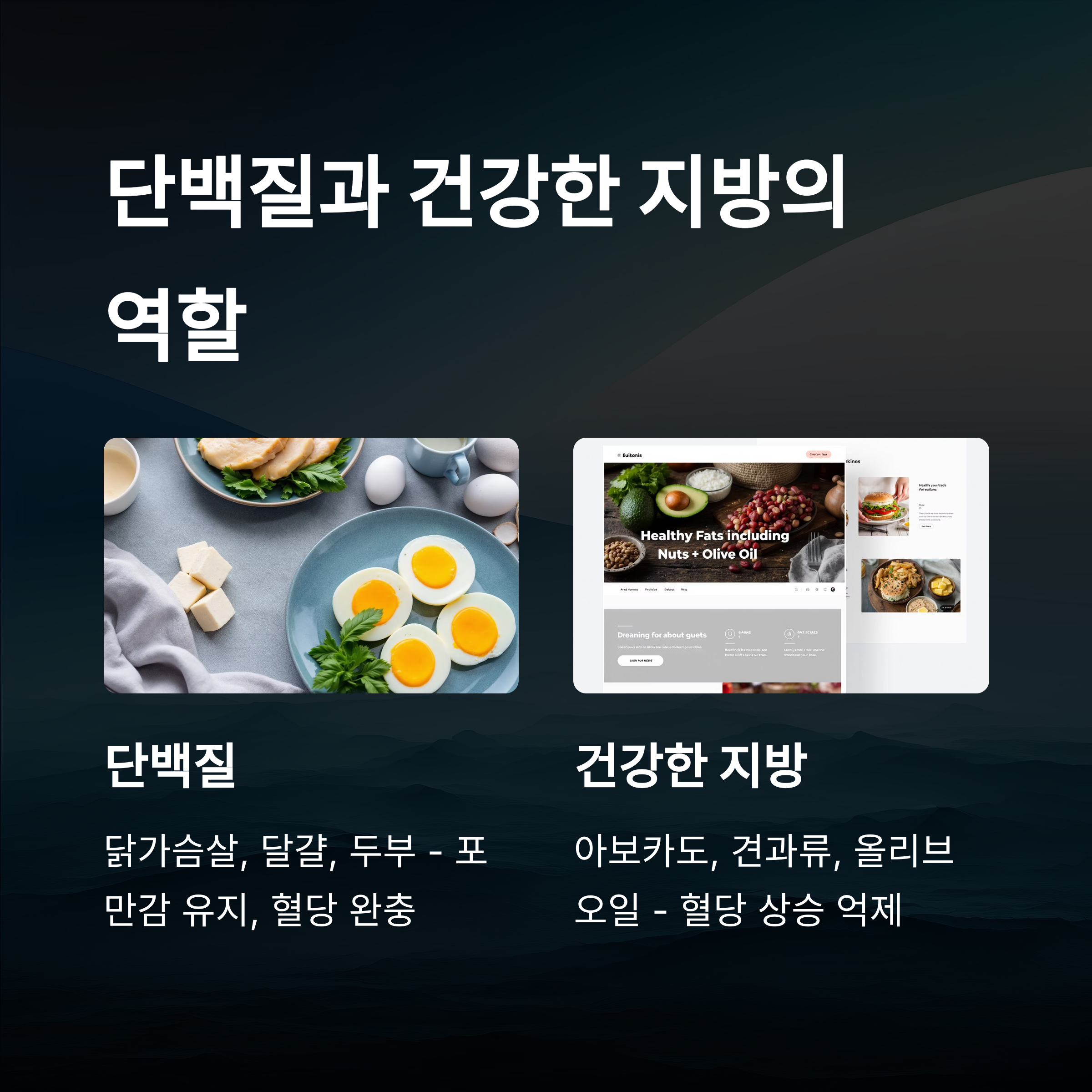 혈당 조절을 위해서는 단백질과 건강한 지방도 함께 섭취하는 것이 중요해요. 단백질과 지방은 소화 속도를 늦추어 탄수화물이 혈당을 급격히 올리는 것을 막아줘요.