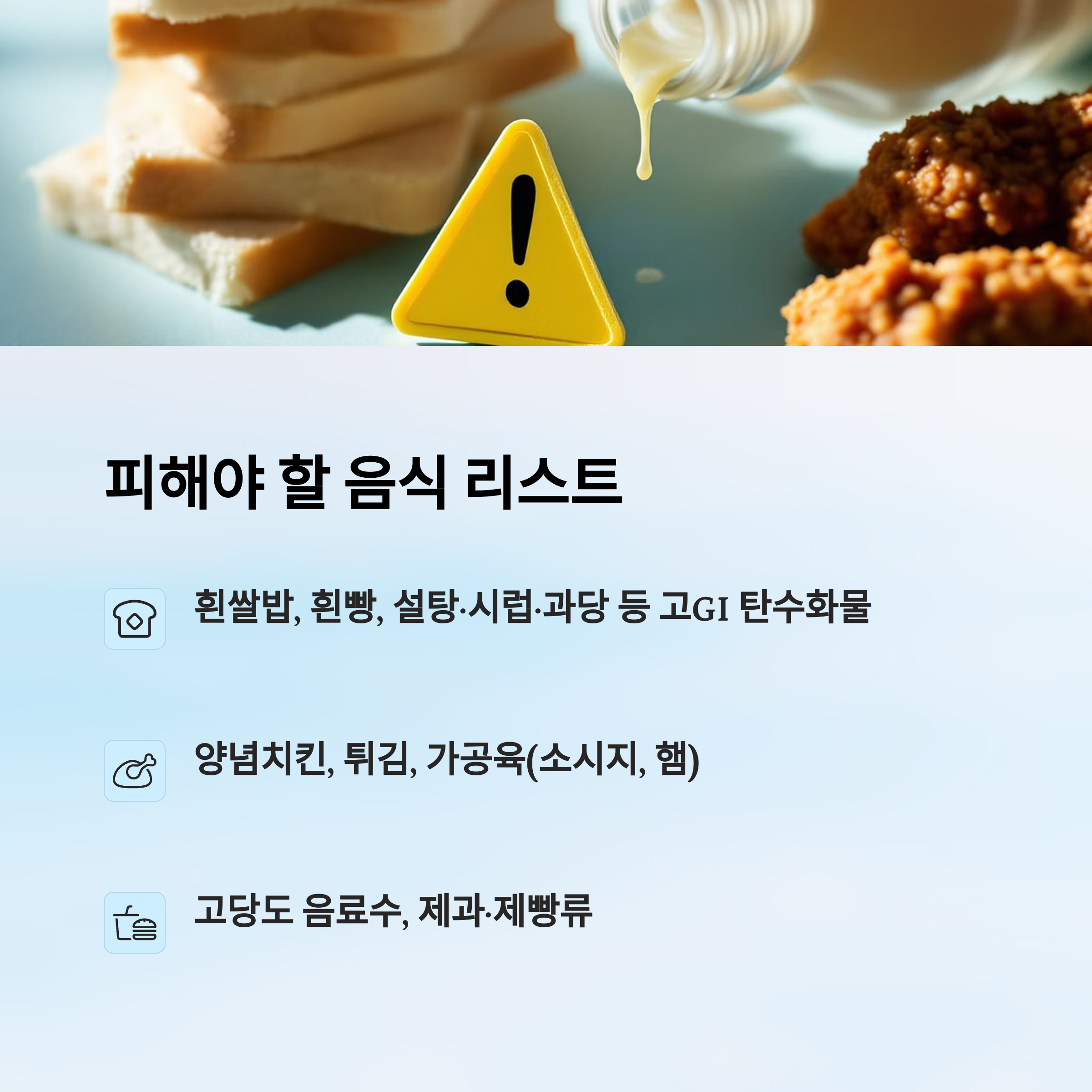혈당 다이어트를 할 때 피해야 할 음식들도 있어요. 특히 당분이 많거나 정제된 탄수화물은 혈당을 급격하게 상승시키므로 주의해야 해요.