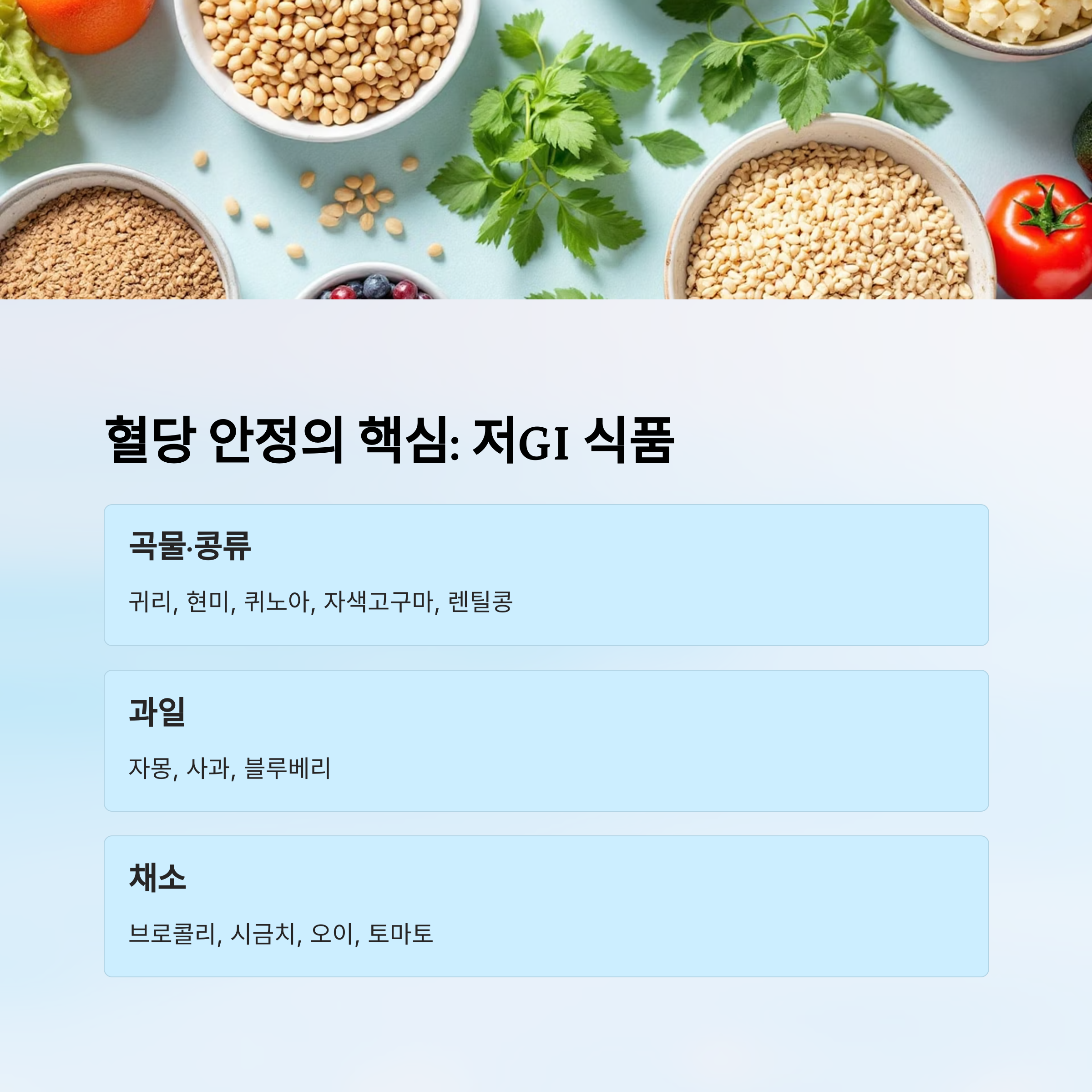 혈당을 조절하기 위해서는 GI(당 지수)가 낮은 음식을 선택하는 것이 중요해요. 저GI 식품은 혈당을 서서히 올리기 때문에 인슐린 과다 분비를 막고, 공복감을 줄이는 효과가 있어요.