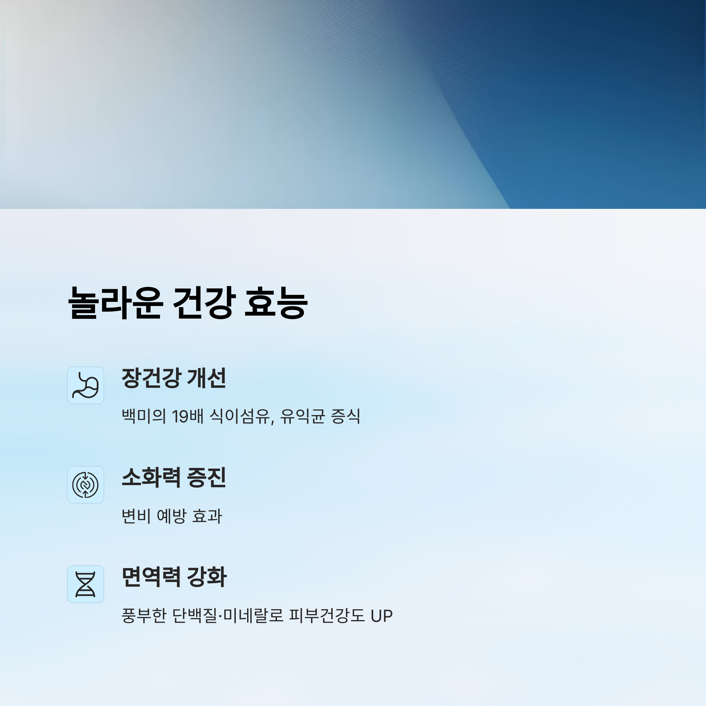 | 장 건강 개선 | 식이섬유 풍부해 유익균 증식 및 배변 활동 촉진 |