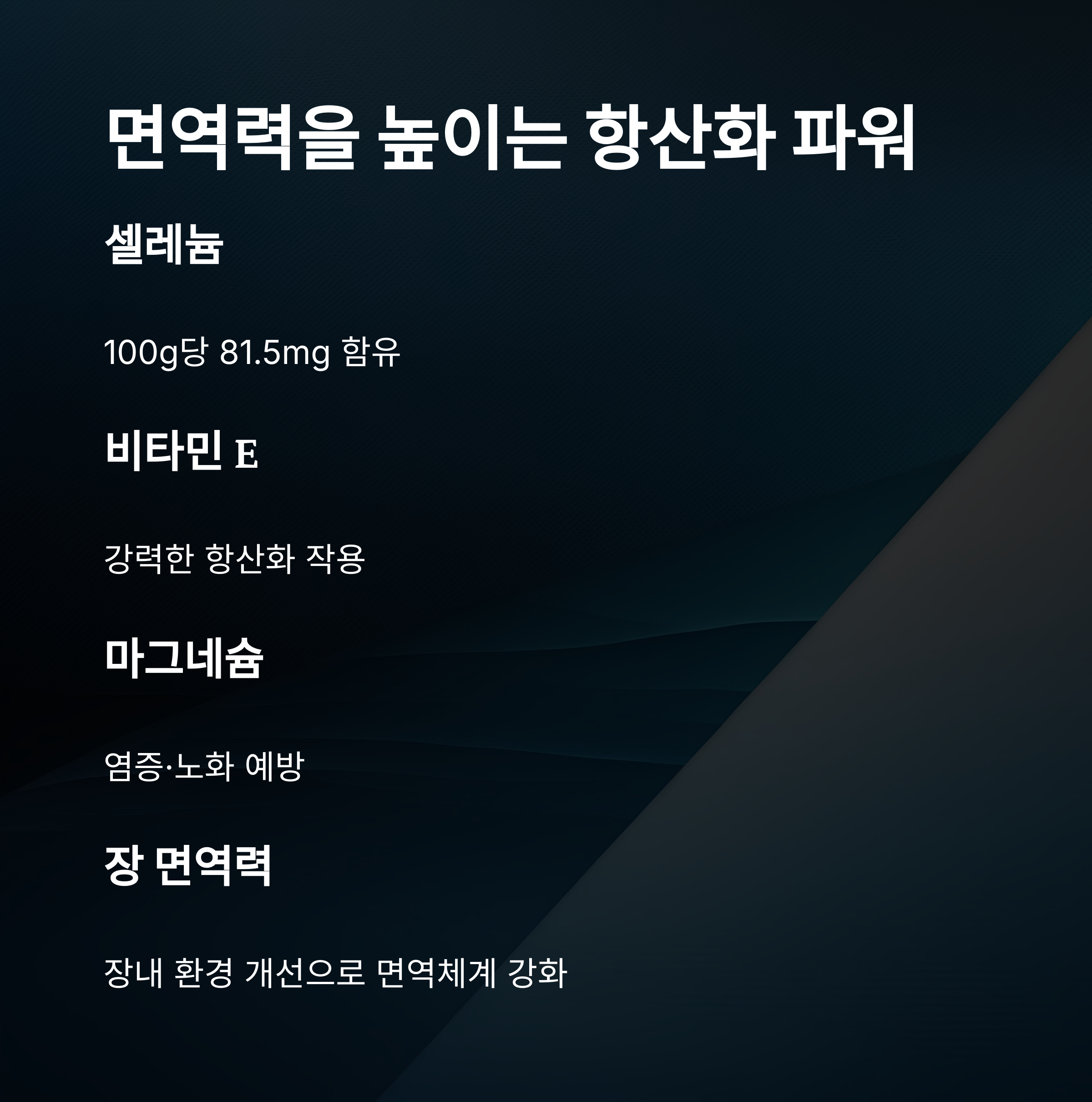 | 항산화 작용 | 셀레늄, 마그네슘, 비타민 E 등으로 세포 손상 방지 |