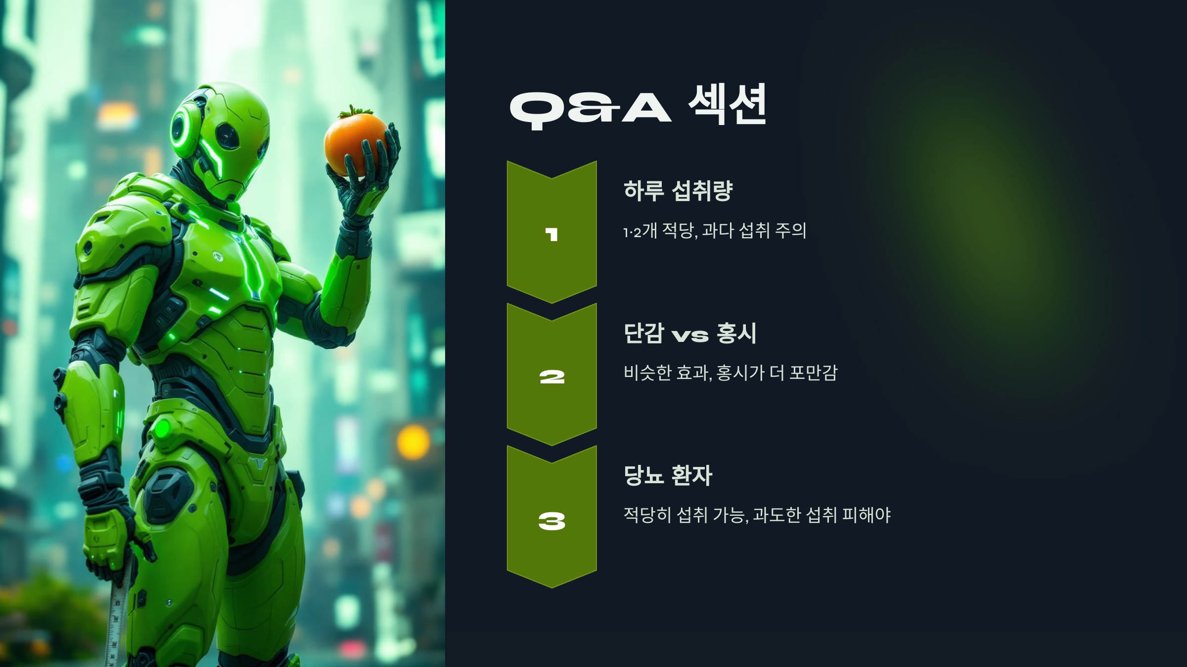 A2: 네, 단감도 비슷한 효과를 줄 수 있지만, 홍시의 부드러운 식감이 더 포만감을 느끼게 합니다.