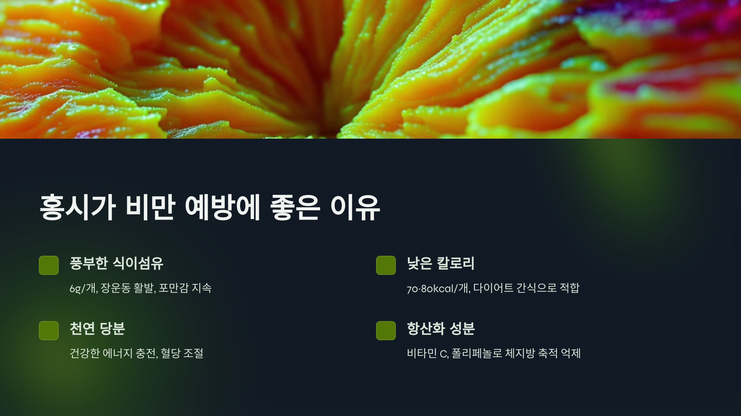홍시 한 개에는 약 6g의 식이섬유가 들어 있습니다. 식이섬유는 장운동을 활발하게 하고 포만감을 오래 지속시켜 과식을 방지합니다. - ✅ 낮은 칼로리