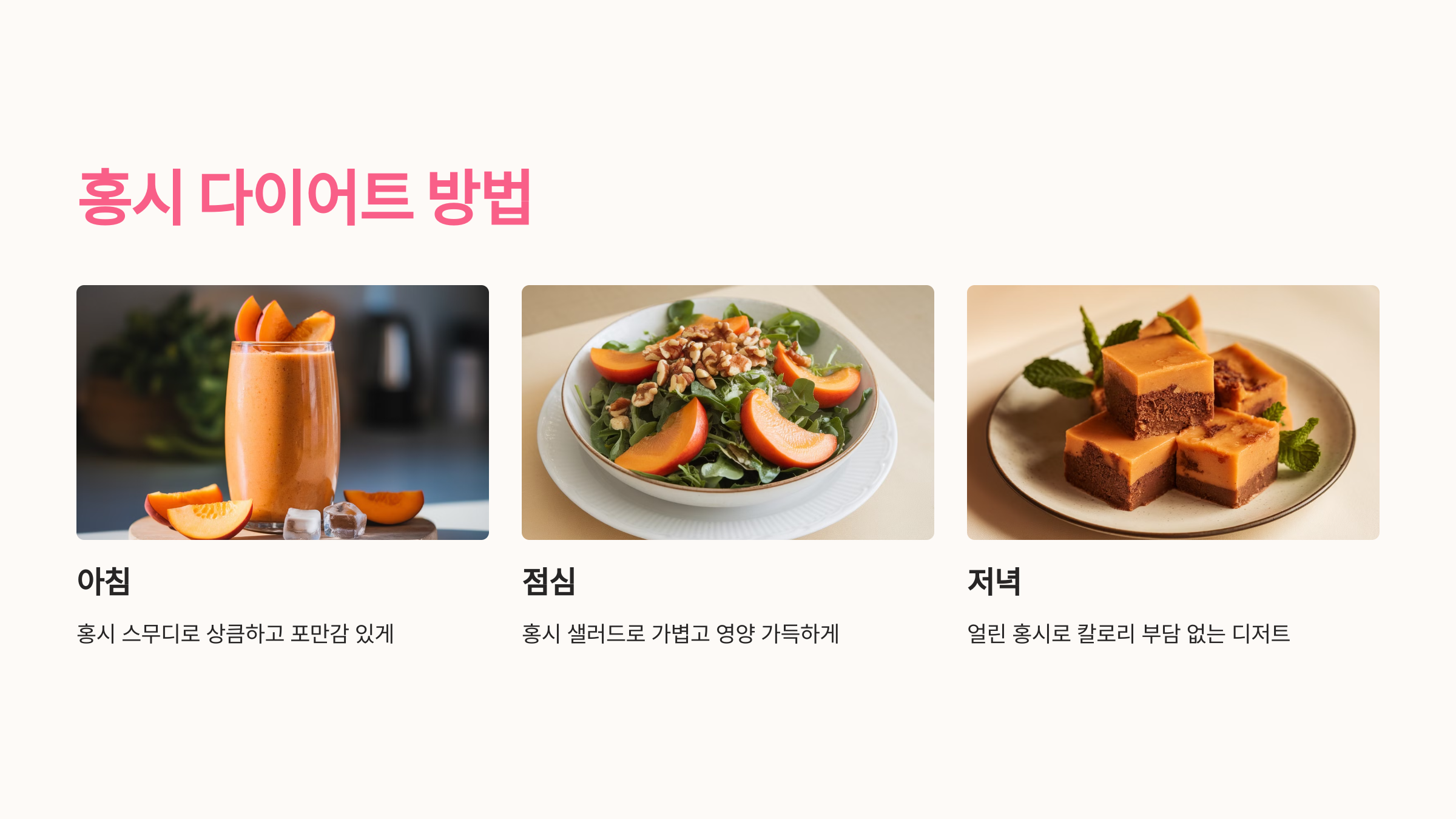 홍시 다이어트는 단순히 홍시만 먹는 방식이 아닙니다! 다양한 방법으로 실천할 수 있어요.
