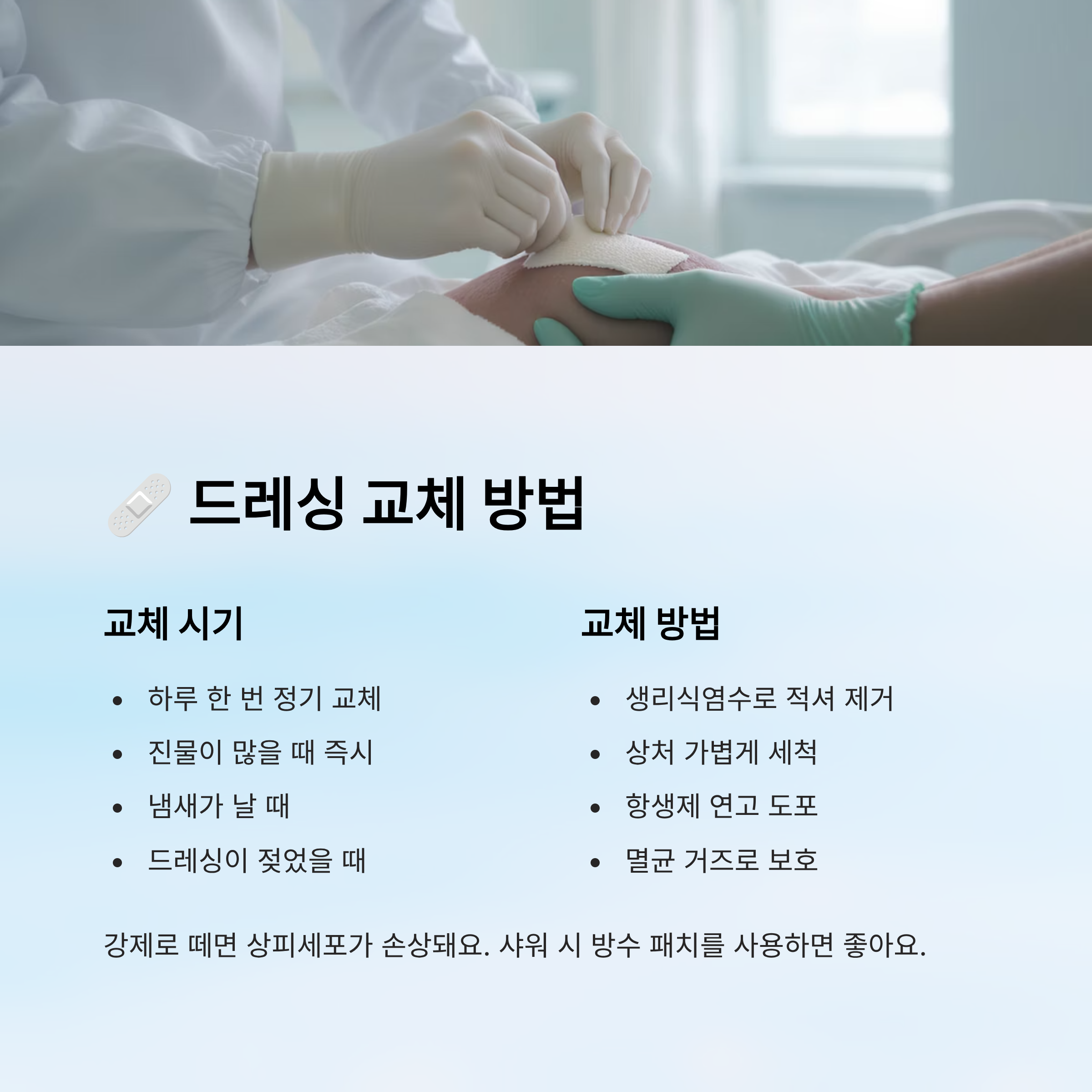 드레싱 교체 후에는 상처를 만지지 않도록 주의하고, 손으로 긁지 말아야 해요. 가려움이 있을 경우 냉찜질이나 재생 크림으로 완화시킬 수 있어요. 또한 물에 오래 닿으면 접착력이 떨어지므로 샤워 시 방수 패치를 사용하면 좋아요. 💧