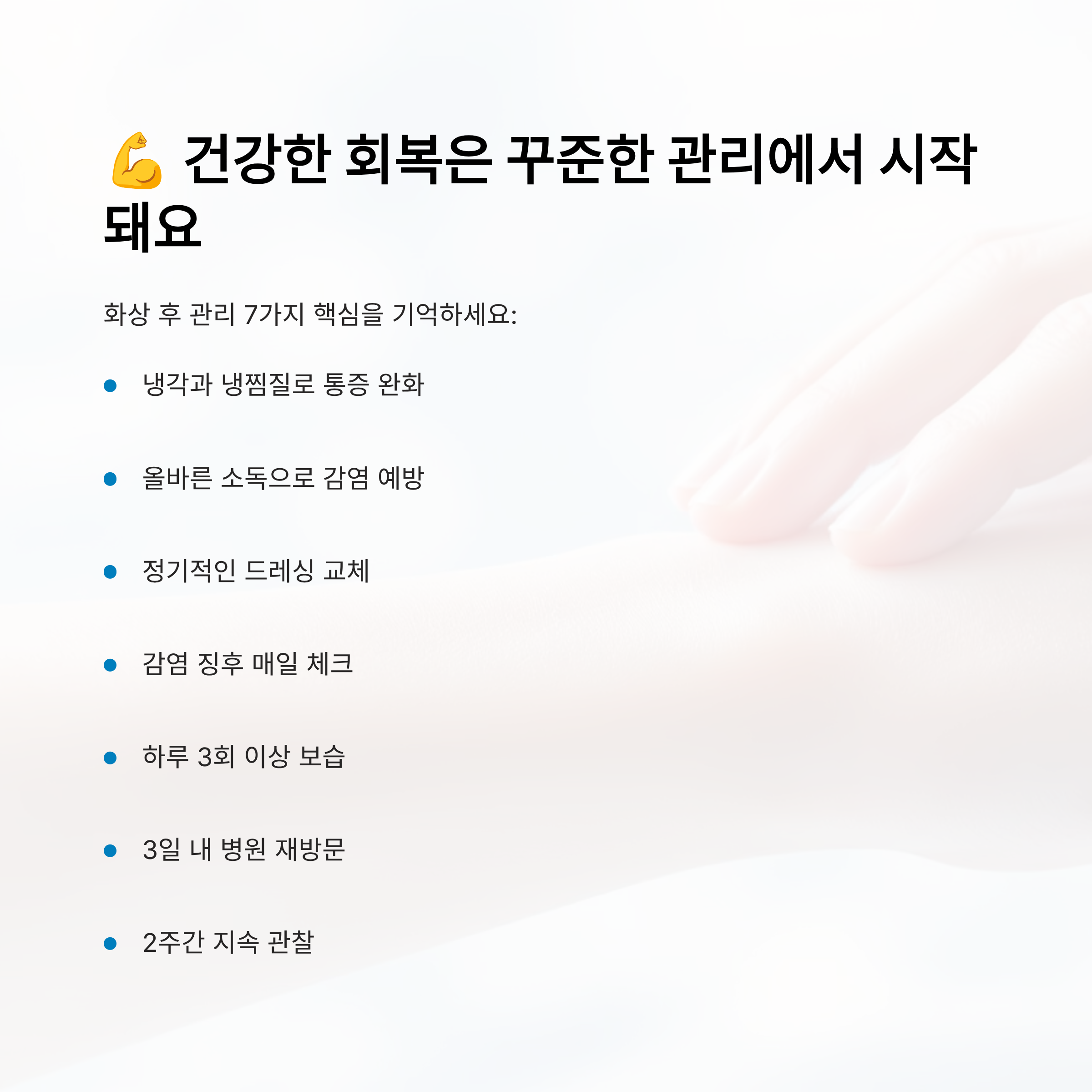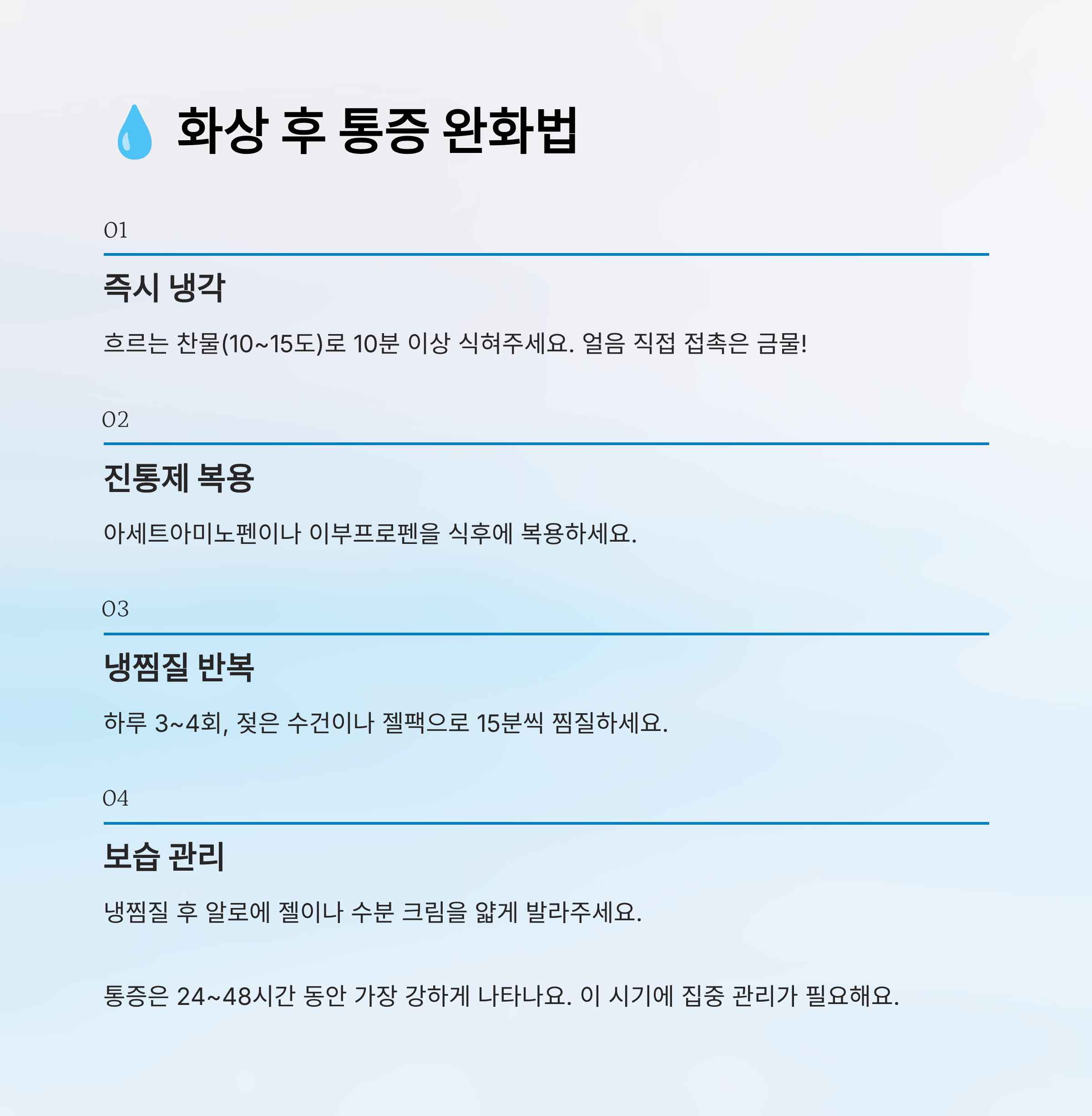 ⚠️ 면책 안내: 이 글은 일반적인 화상 관리법을 안내하는 정보이며, 증상이 심하거나 감염이 의심될 경우 반드시 전문의 진료를 받아야 해요.