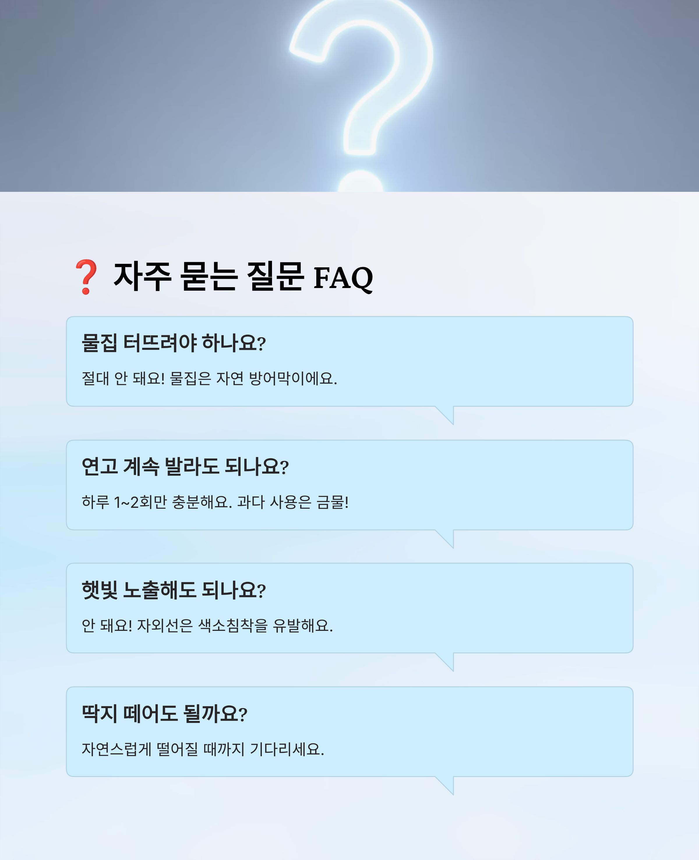 A8. 억지로 떼면 흉터가 남아요. 자연스럽게 떨어질 때까지 보습제를 충분히 발라두세요.