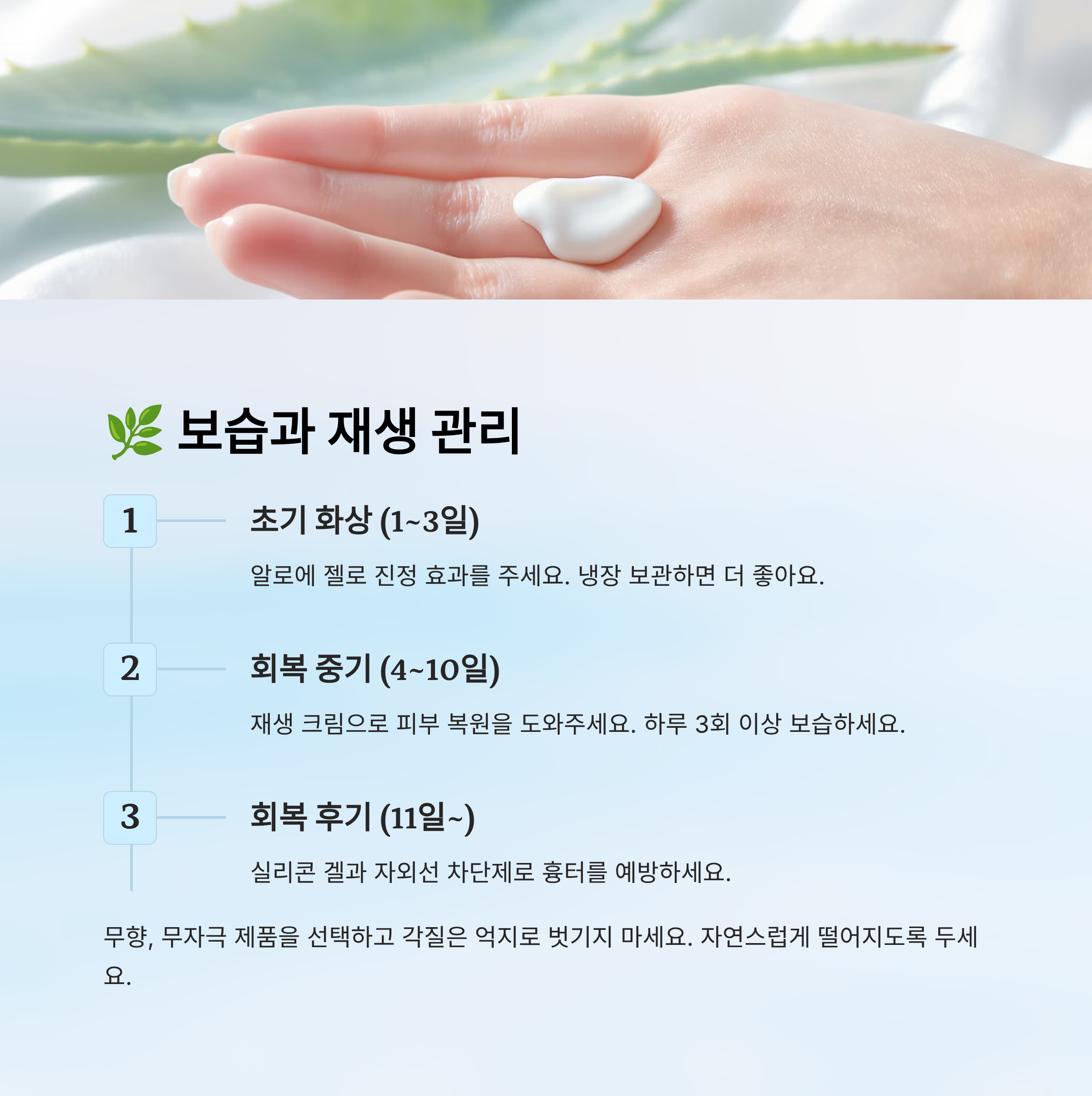 보습제는 무향, 무자극 제품을 선택하고, 가능한 한 유분감이 적은 수분크림을 사용하는 게 좋아요. 상처 부위가 완전히 아물기 전에는 재생 연고나 실리콘 겔을 사용해 피부 회복을 돕는 방법도 있어요. 또한 자외선 차단제를 함께 사용하면 색소침착을 예방할 수 있답니다. ☀️