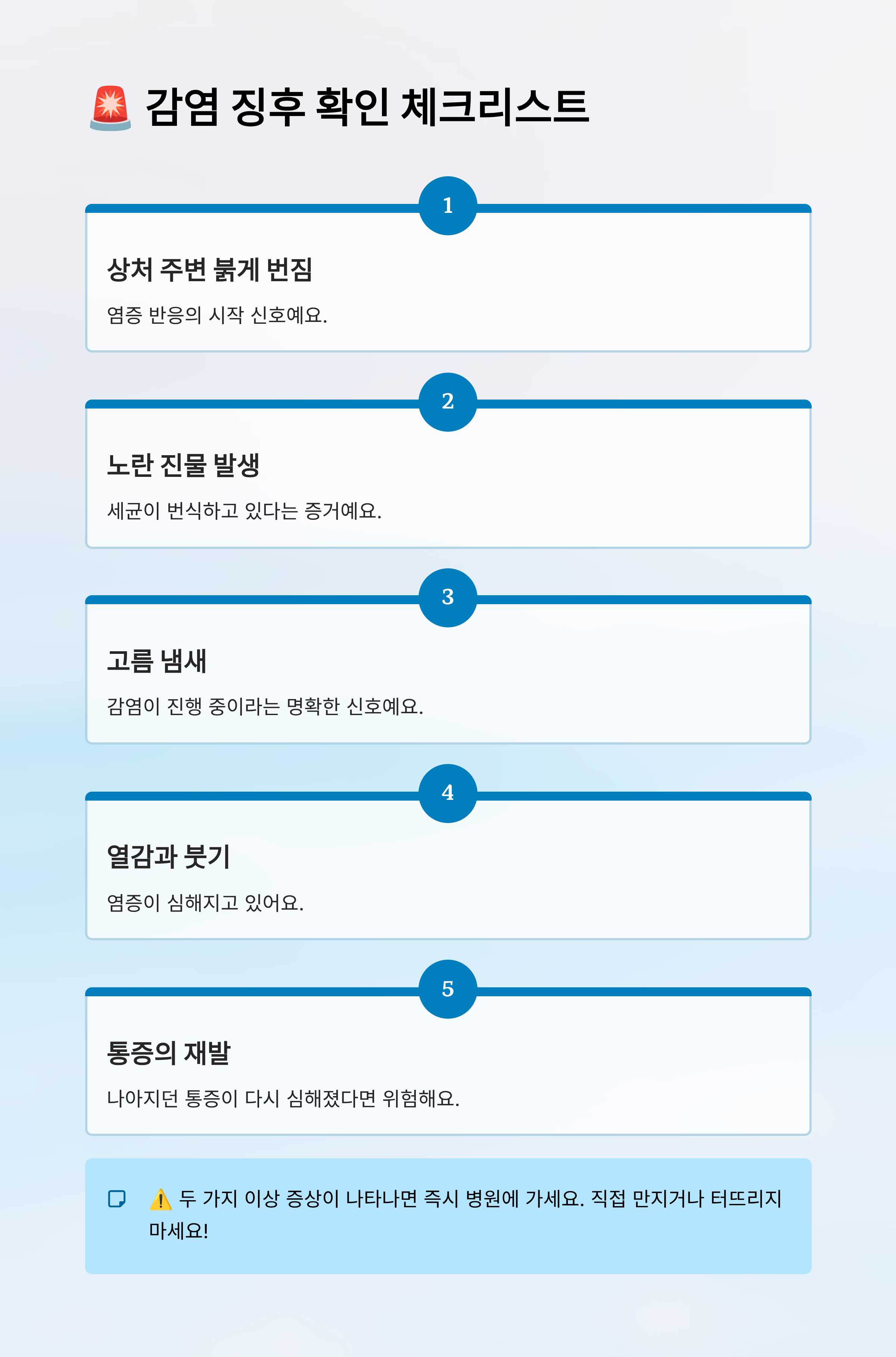 감염이 의심되는 대표적인 징후는 다음과 같아요. ① 상처가 붉게 번짐, ② 노란 진물 발생, ③ 고름 냄새, ④ 열감, ⑤ 통증의 재발. 이 중 두 가지 이상이 동시에 나타나면 감염 가능성이 높아요. 이때는 즉시 드레싱을 제거하지 말고 병원에 가야 해요. 직접 만지거나 터뜨리면 오히려 세균이 더 깊이 침투할 수 있거든요.