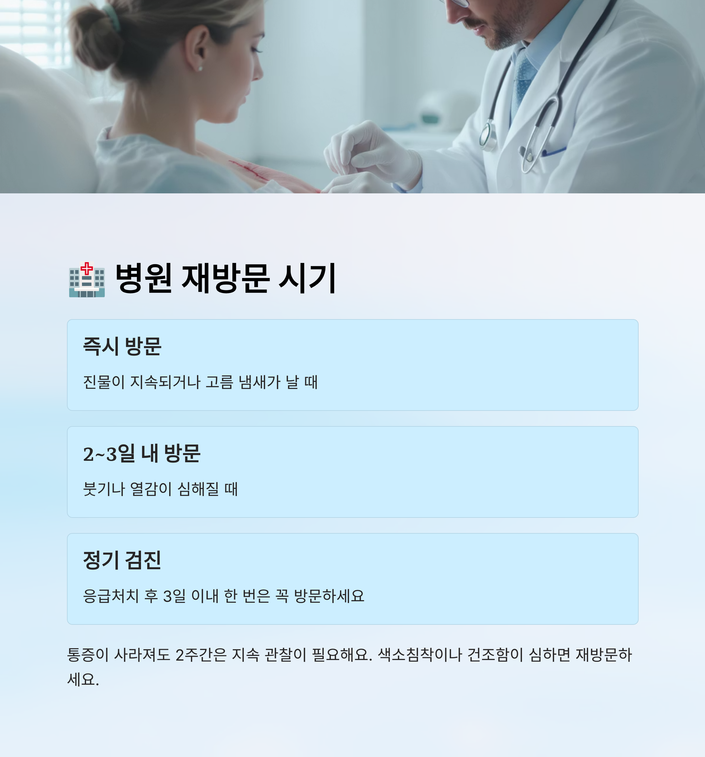 A2. 통증이 48시간 이상 지속되거나 상처가 붓고 진물이 나면 즉시 병원에 가야 해요.