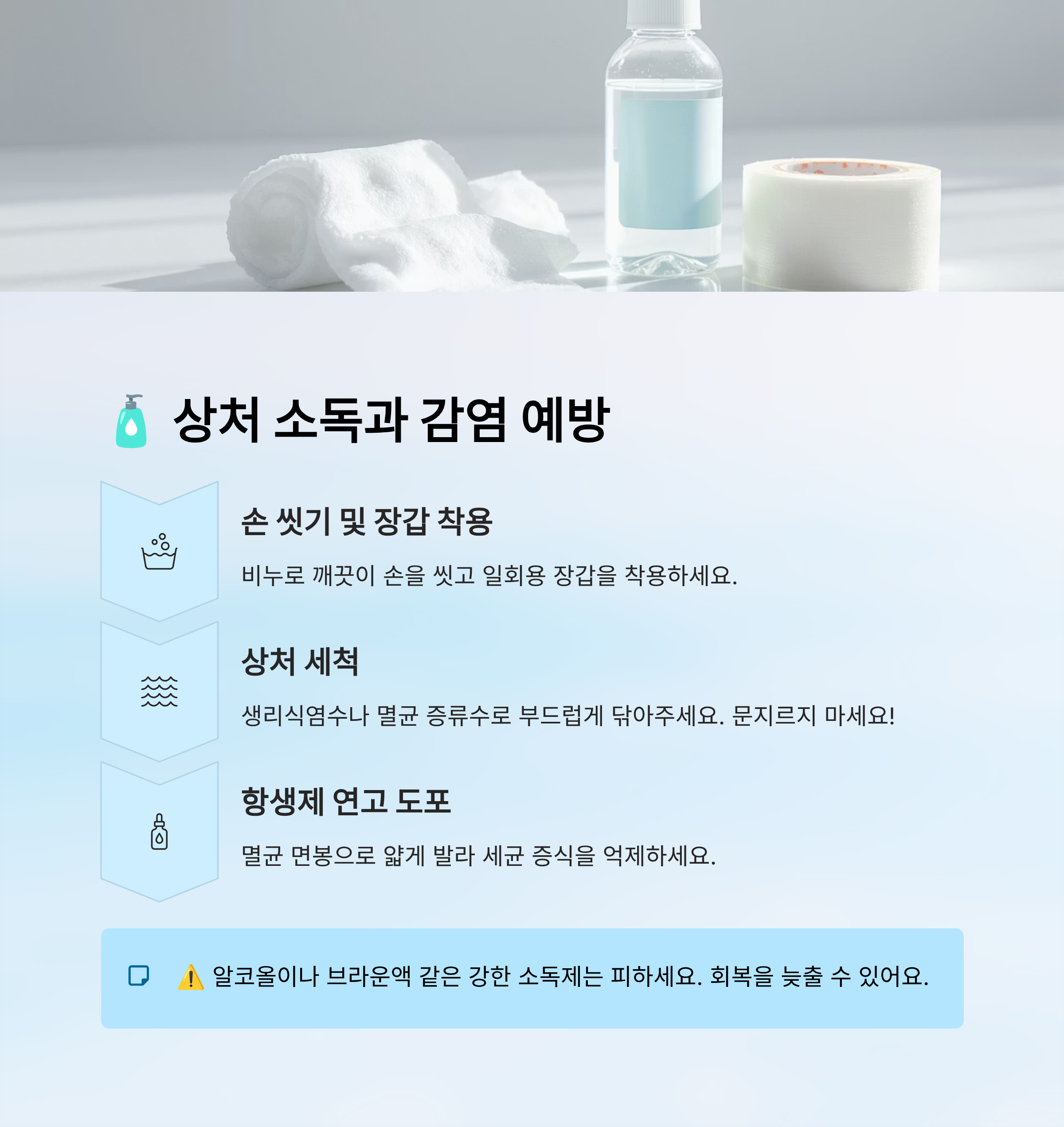감염 예방을 위해선 상처를 항상 청결하게 유지하고, 손으로 만지지 않으며, 통풍이 잘 되는 환경을 만들어주는 것이 좋아요. 또한 상처 주변에 뾰루지가 생기거나 가려움이 심해진다면 알레르기 반응일 수 있으니 전문의 상담을 받아야 해요. 🧴
