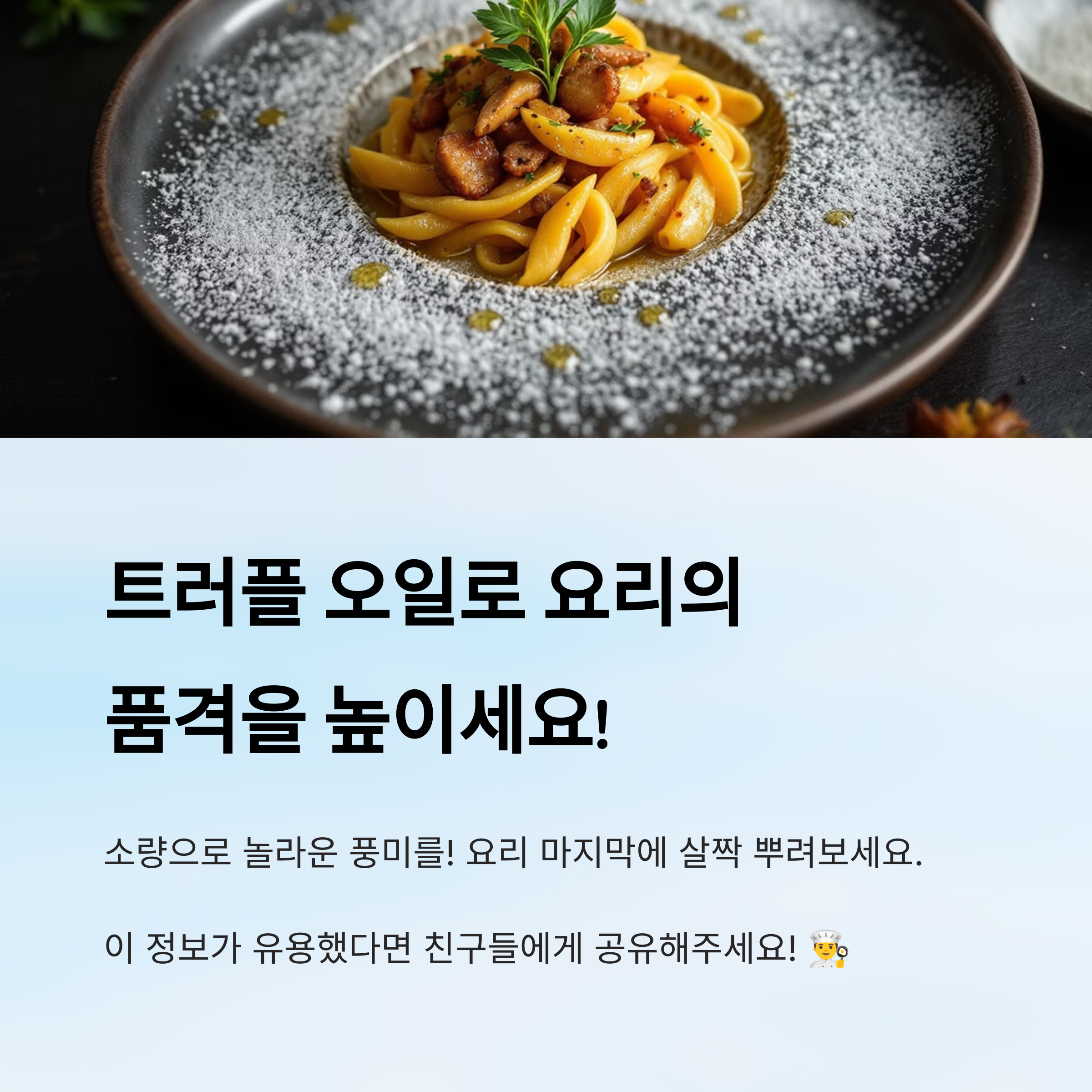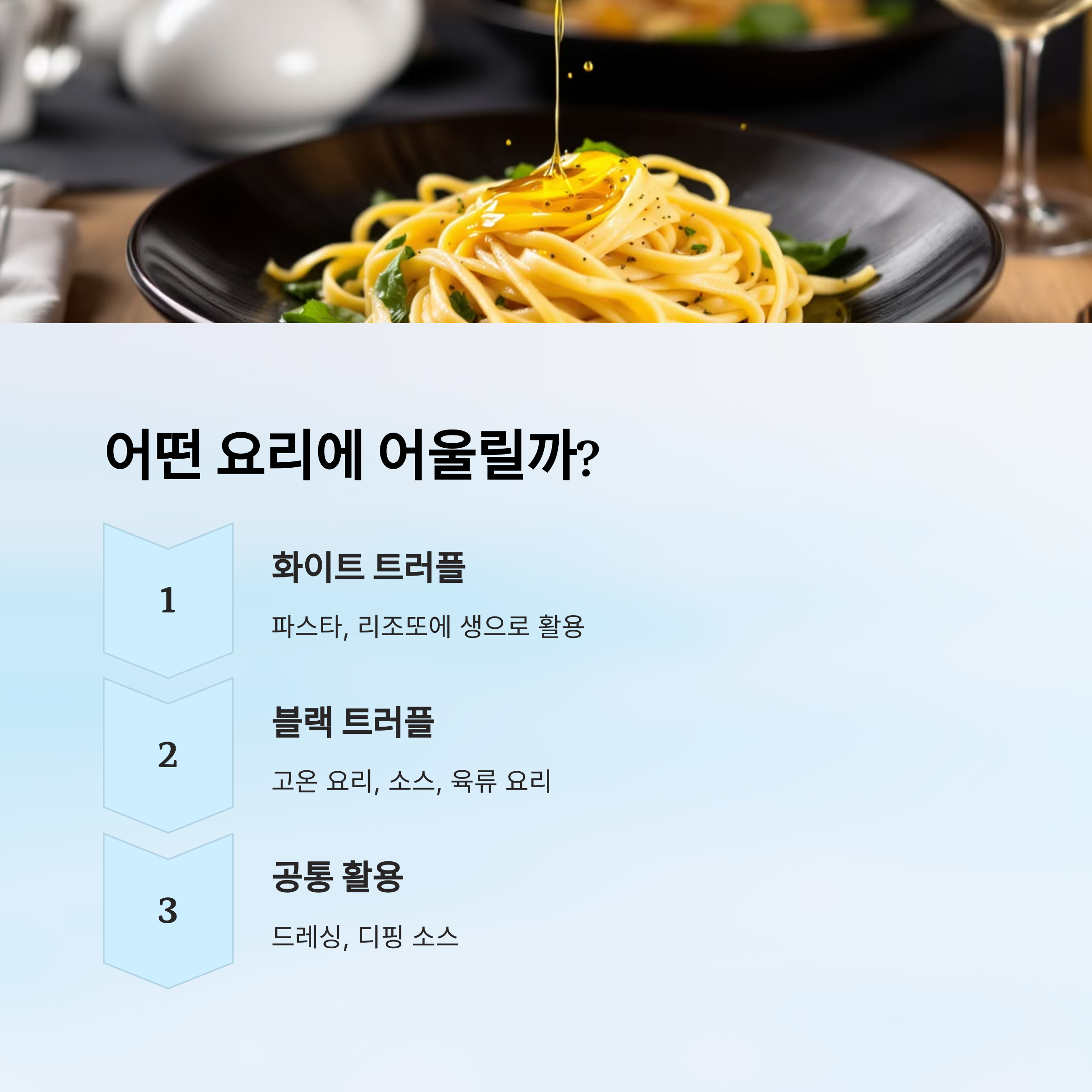 즉, 요리의 ‘무게감’에 따라 트러플 오일도 다르게 쓰는 게 맛있게 먹는 팁이에요! 🍽️