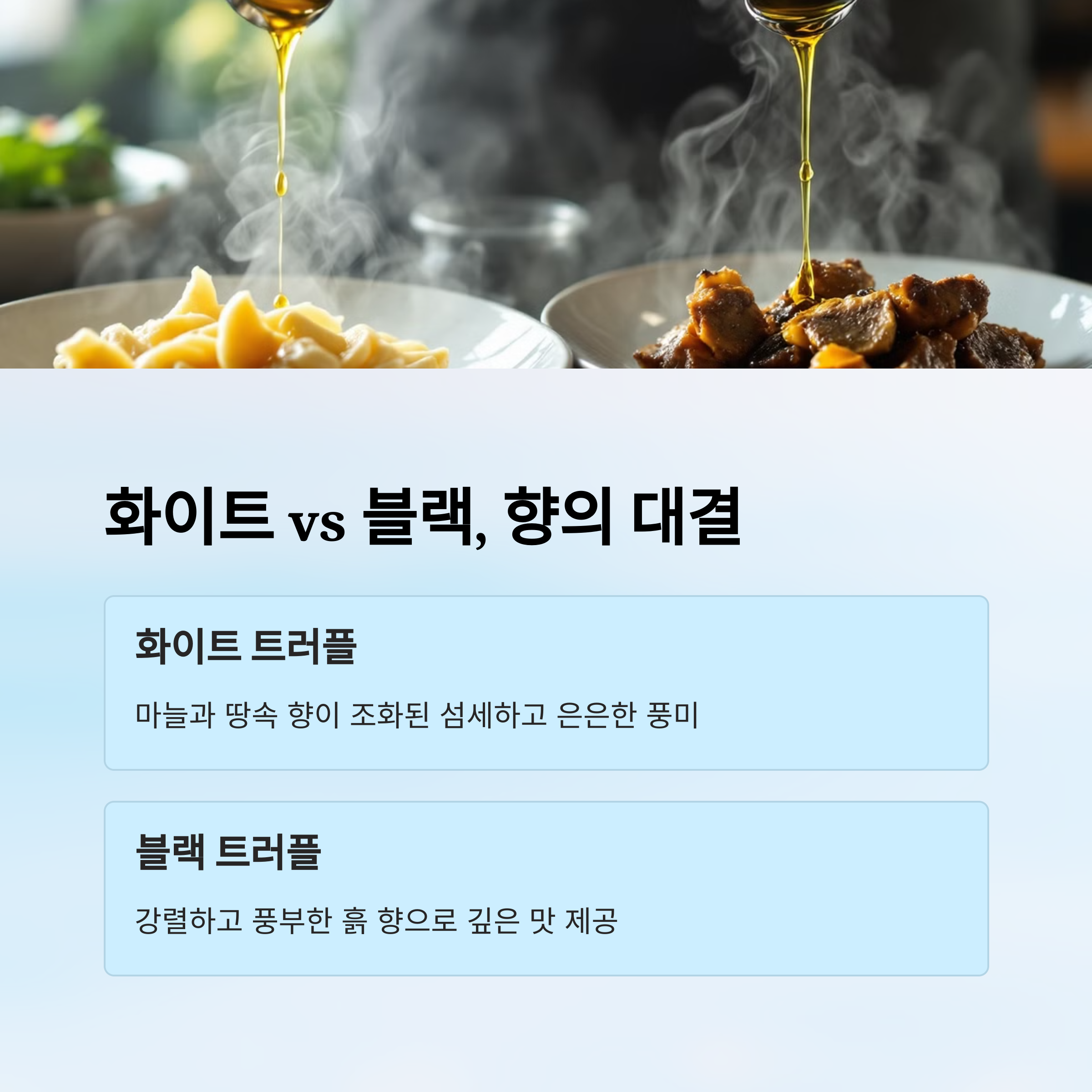 즉, 화이트 트러플 오일은 섬세함을, 블랙 트러플 오일은 깊은 풍미를 강조한답니다.
