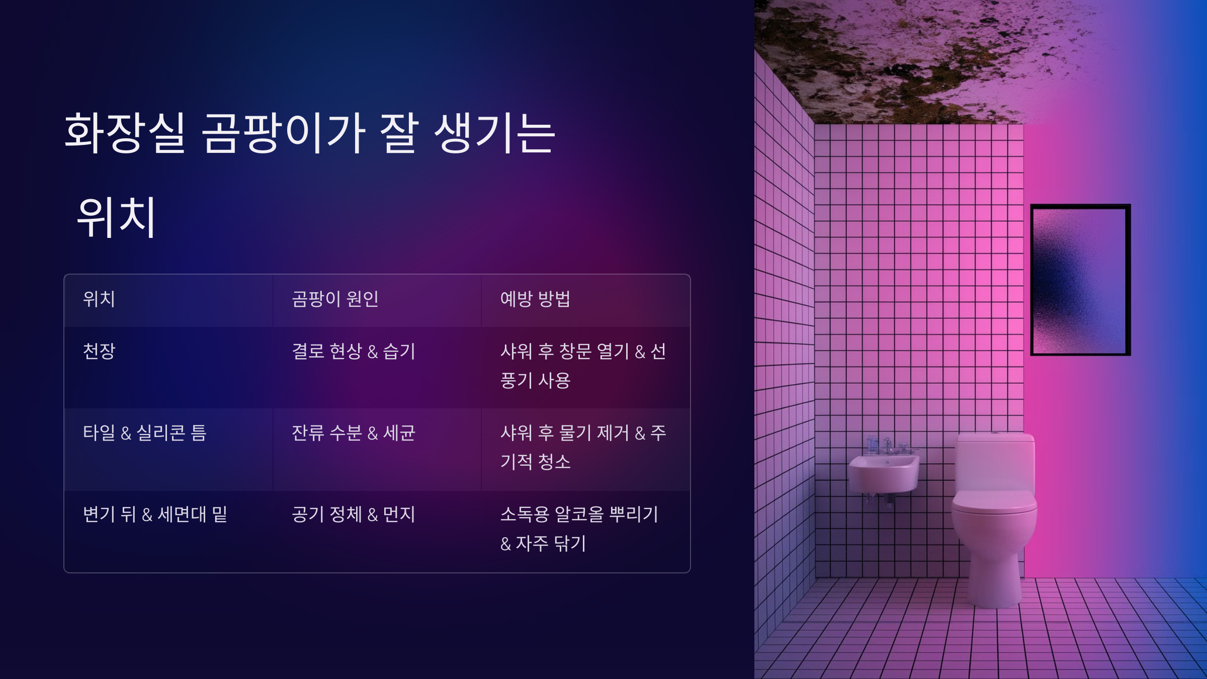 | 타일 & 실리콘 틈 | 잔류 수분 & 세균 | 샤워 후 물기 제거 & 주기적 청소 |