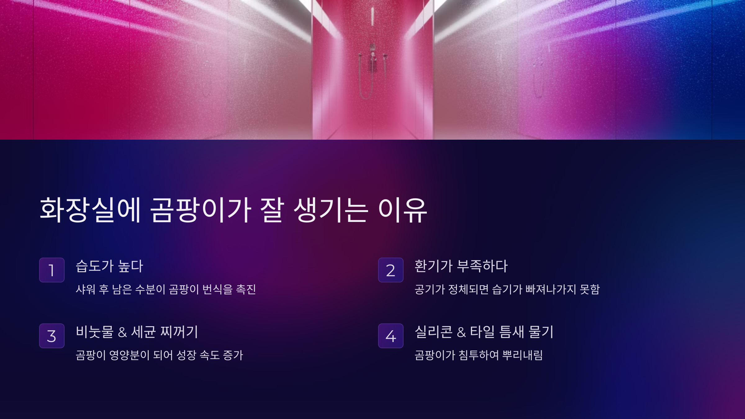 ✔ **습도가 높다** → 샤워 후 남은 수분이 곰팡이 번식을 촉진 ✔ **환기가 부족하다** → 공기가 정체되면 습기가 빠져나가지 못함 ✔ **비눗물 & 세균 찌꺼기** → 곰팡이 영양분이 되어 성장 속도 증가 ✔ **실리콘 & 타일 틈새 물기 잔류** → 곰팡이가 침투하여 뿌리내림