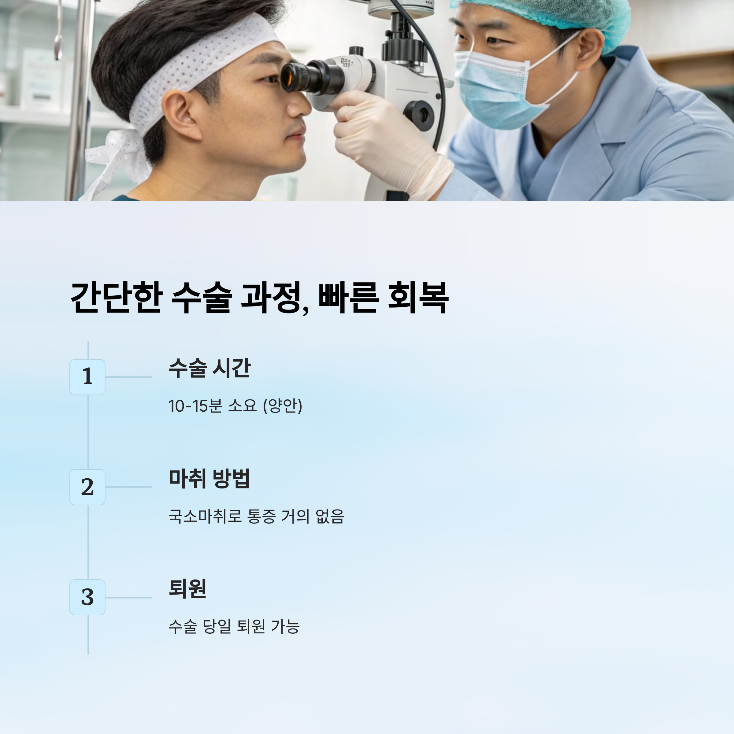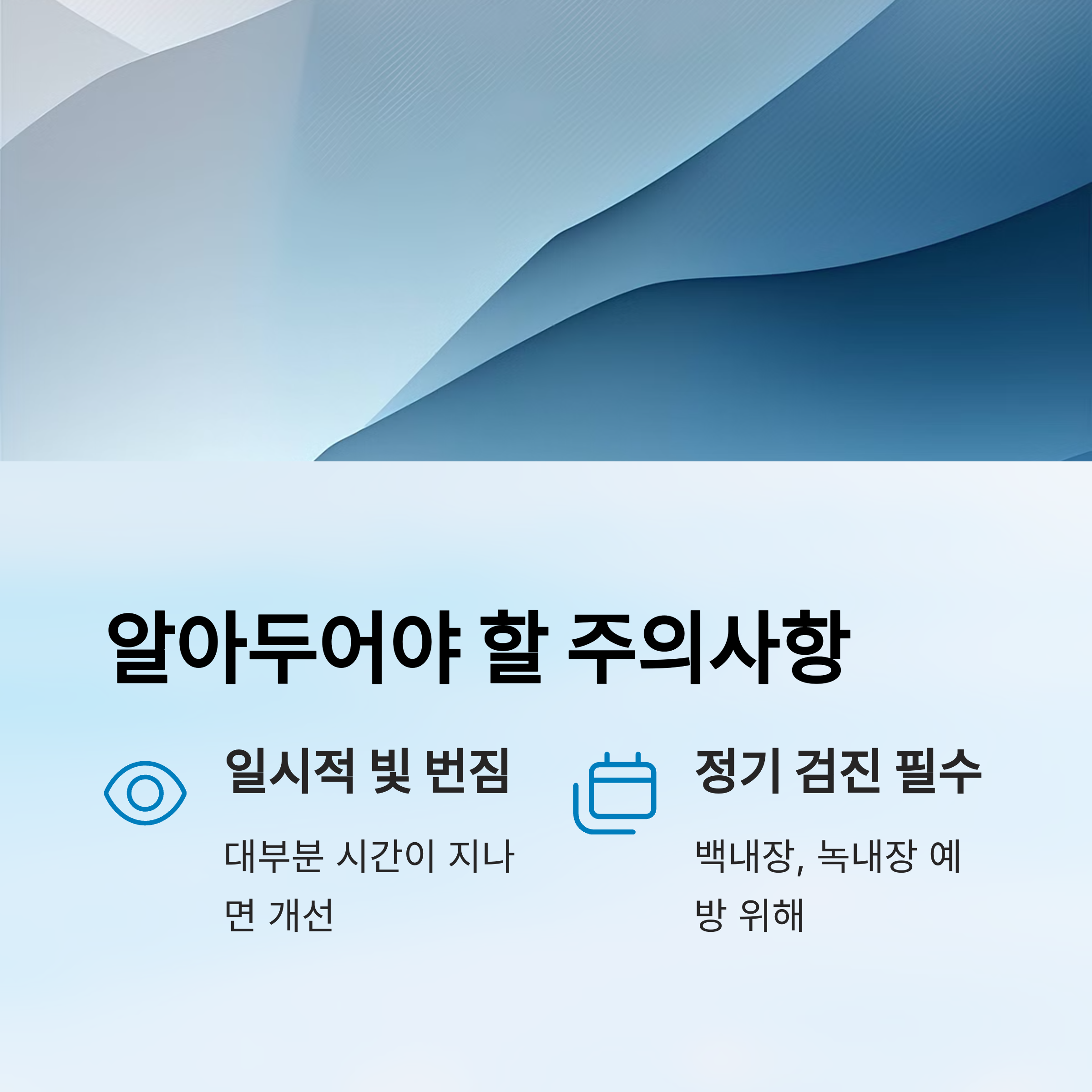수술 직후에는 빛 번짐이나 눈부심이 있을 수 있지만, 대부분 **2~3일 내에 빠르게 호전**돼요. 하지만 눈을 문지르거나 무리한 활동은 피해야 해요! 🚨