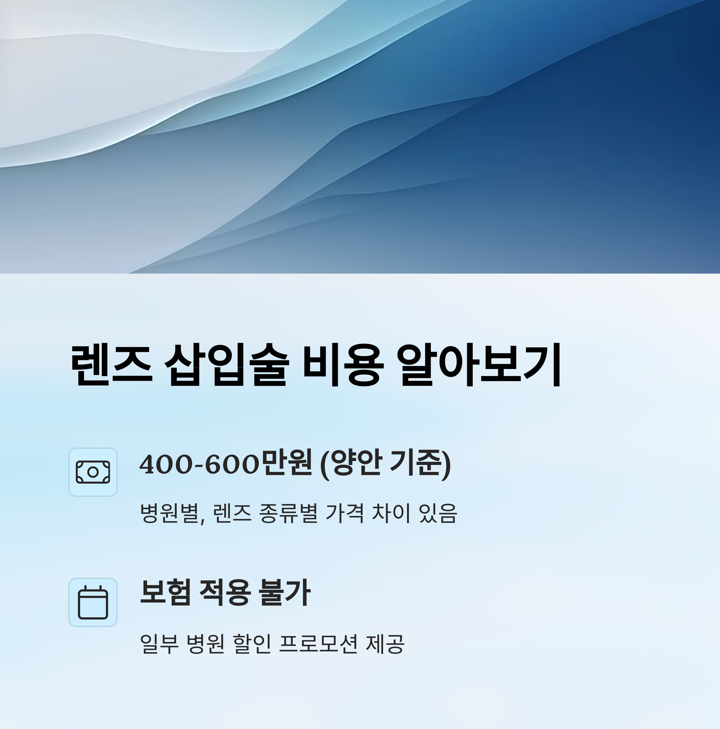 비용은 **렌즈 종류, 병원 규모, 의료진의 경력** 등에 따라 다를 수 있어요. 특히, 고급 렌즈를 사용할 경우 가격이 더 비싸질 수 있답니다.