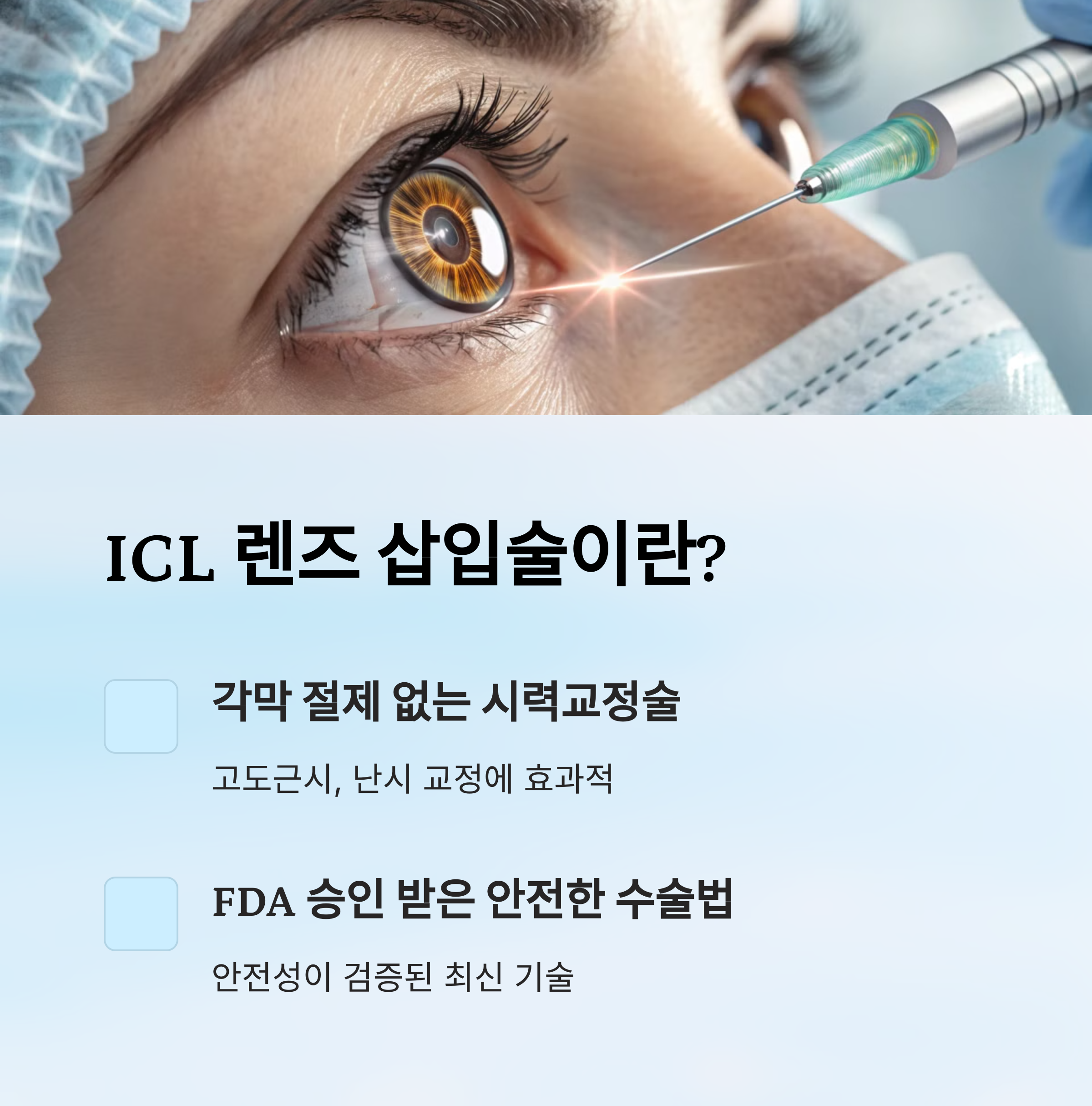 렌즈 삽입술(ICL)은 비용이 다소 비싸지만, **각막을 깎지 않기 때문에 회복이 빠르고 부작용 위험이 적어요!** 🤓