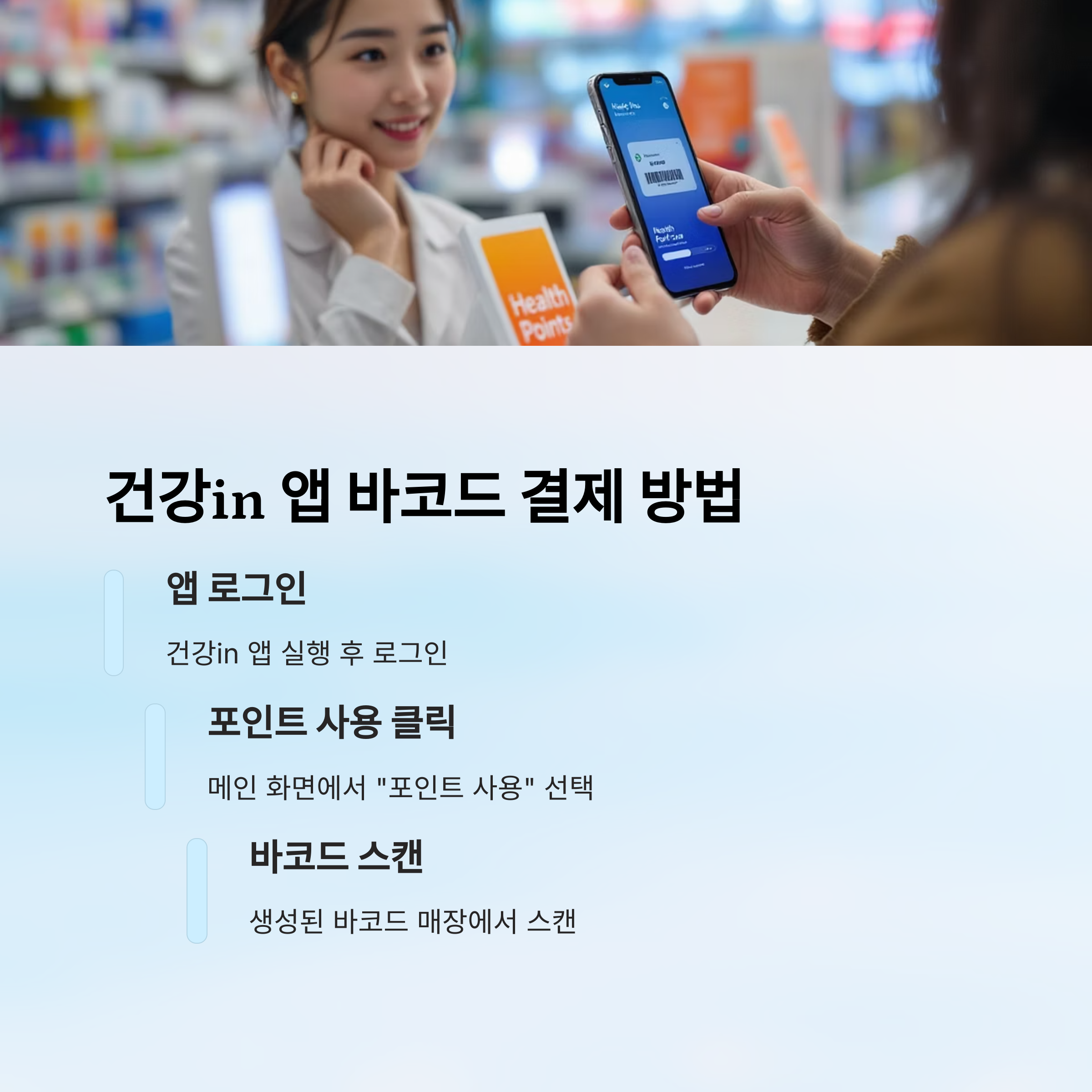 건강포인트를 오프라인에서 쓸 땐 '건강in 앱'을 설치해서 바코드 결제를 활용하는 게 제일 간편해요. 건강in 앱은 국민건강보험공단 공식 앱으로, 내 건강기록부터 포인트, 검진결과까지 다 관리할 수 있답니다.