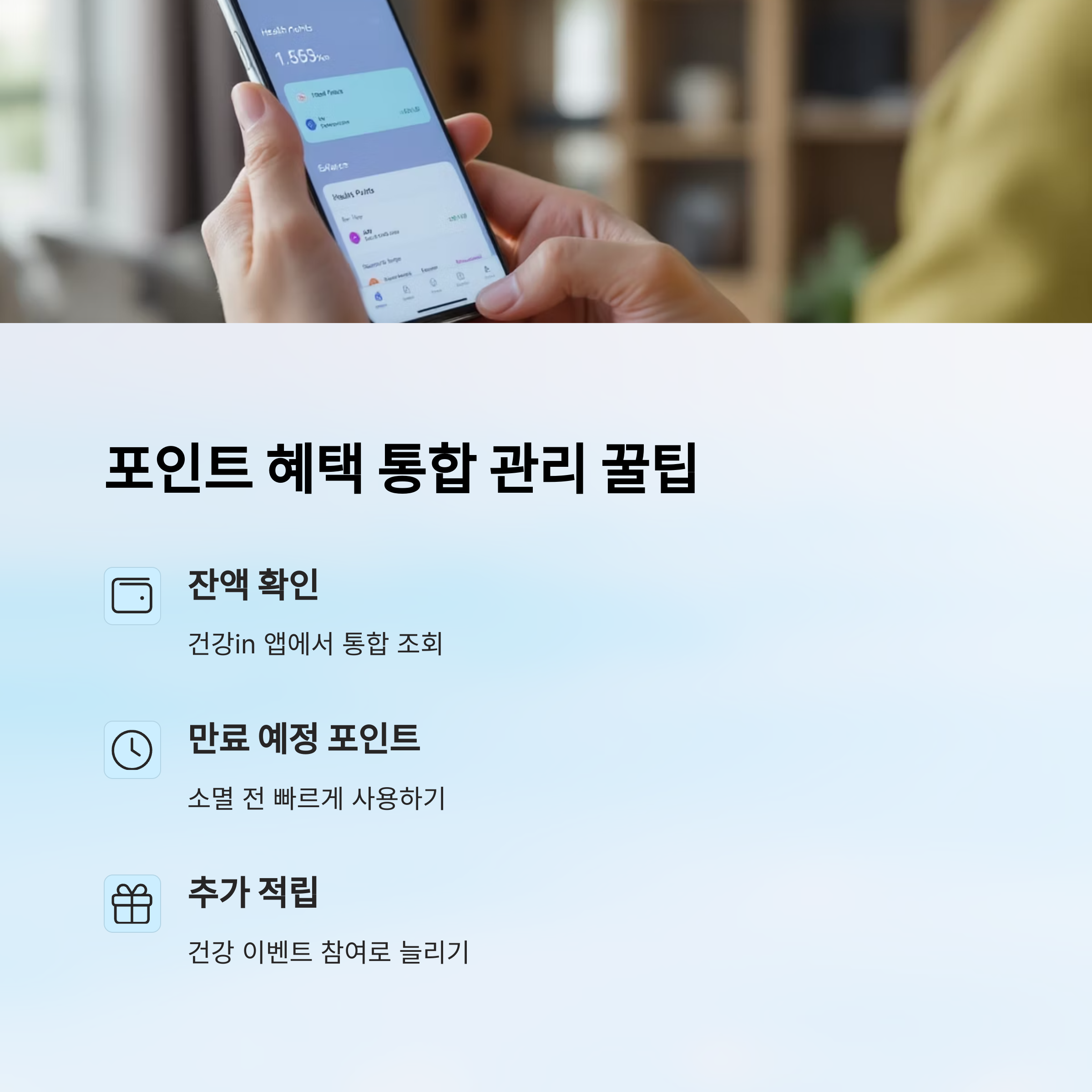 가장 먼저 해야 할 일은 건강in 앱이나 웹사이트에서 ‘포인트 현황’을 수시로 확인하는 거예요. 참여 이력이 누적되면, 자동으로 포인트가 들어오기도 하니까 확인은 필수예요.