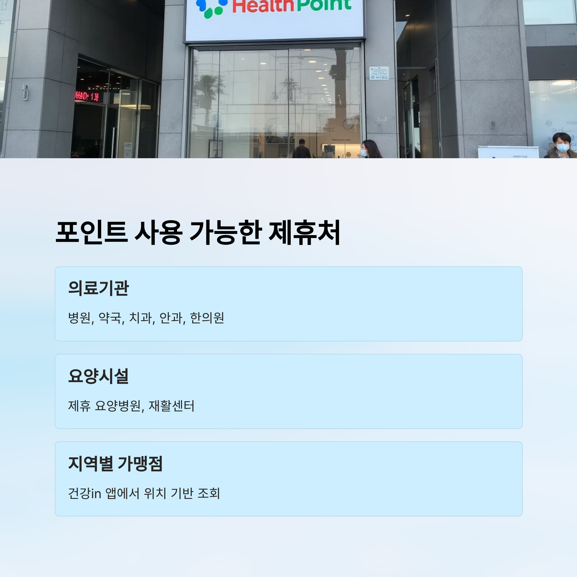 예를 들어 병원 진료 후 본인부담금 결제에 포인트를 사용할 수 있고, 약국에서 처방전 약 수령 시 포인트로 일부 결제가 가능해요. 특히 만 65세 이상 어르신이라면 사용 가능한 제휴기관이 더 많답니다.