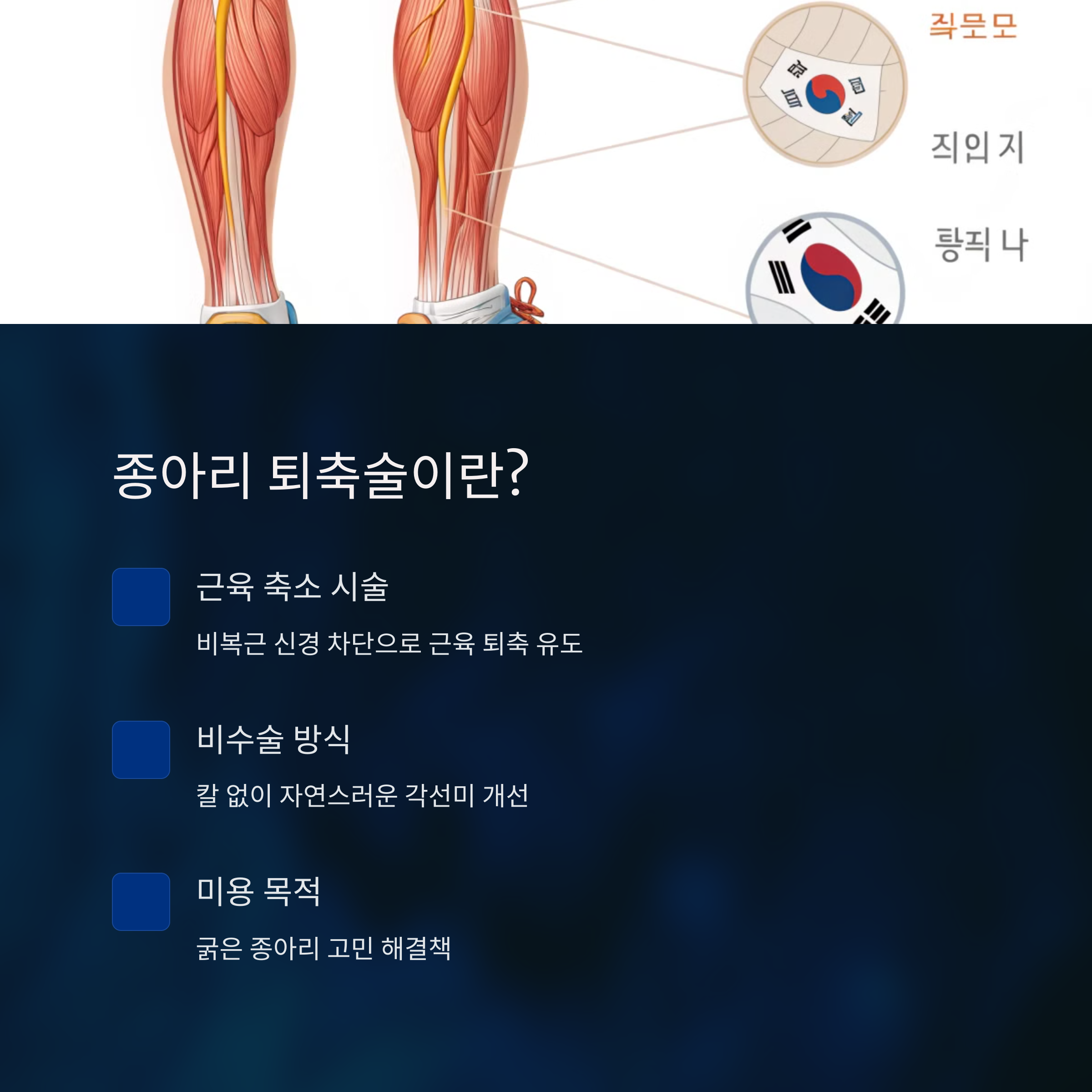 종아리 퇴축술은 종아리 근육을 줄여서 다리 라인을 더 가늘고 길어 보이게 만드는 시술이에요. 근육형 종아리로 고민하는 사람들에게 많이 추천되는 방법이죠.