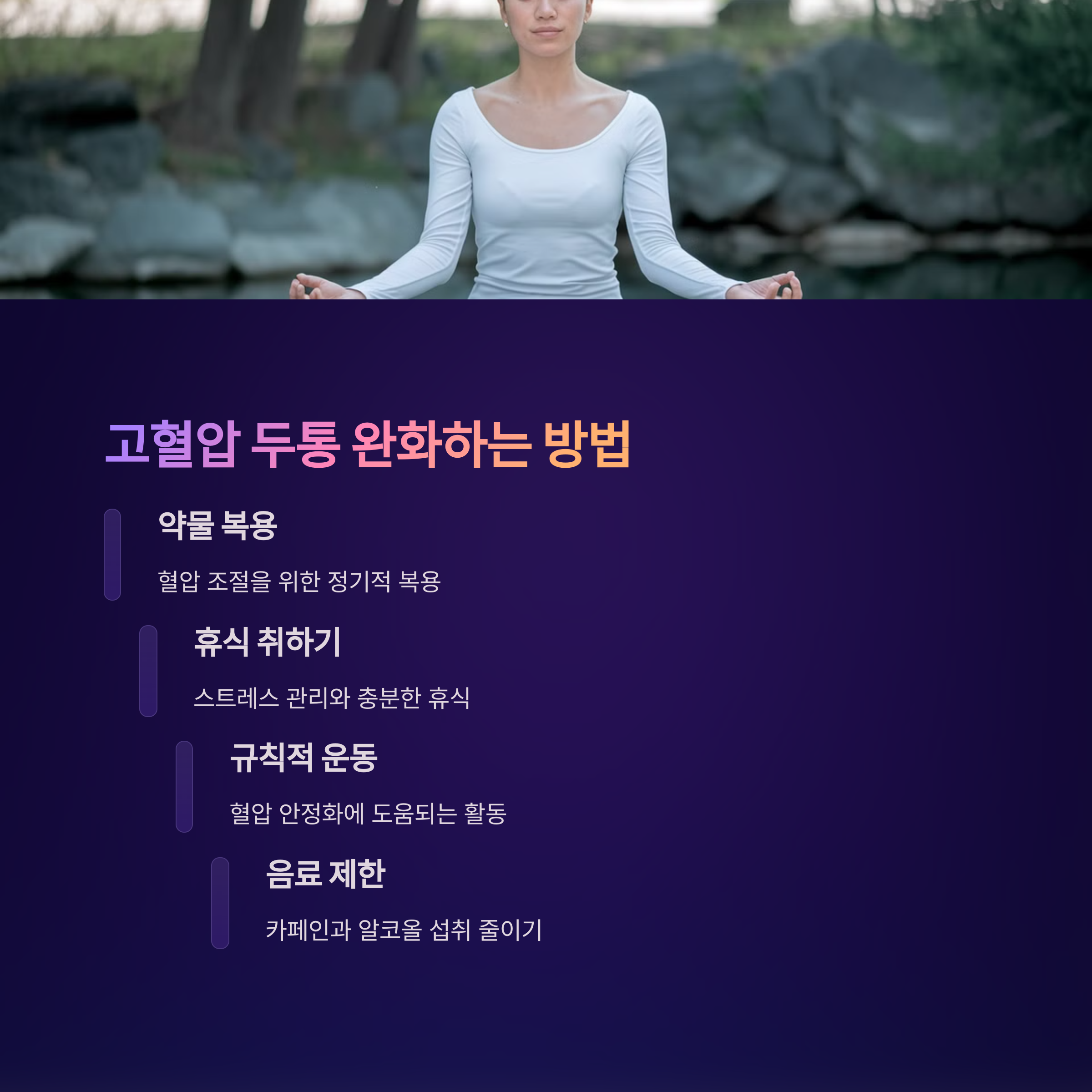 | 심호흡 & 명상 | 깊게 숨 쉬면 혈압이 안정되고 두통이 완화될 수 있어요 |