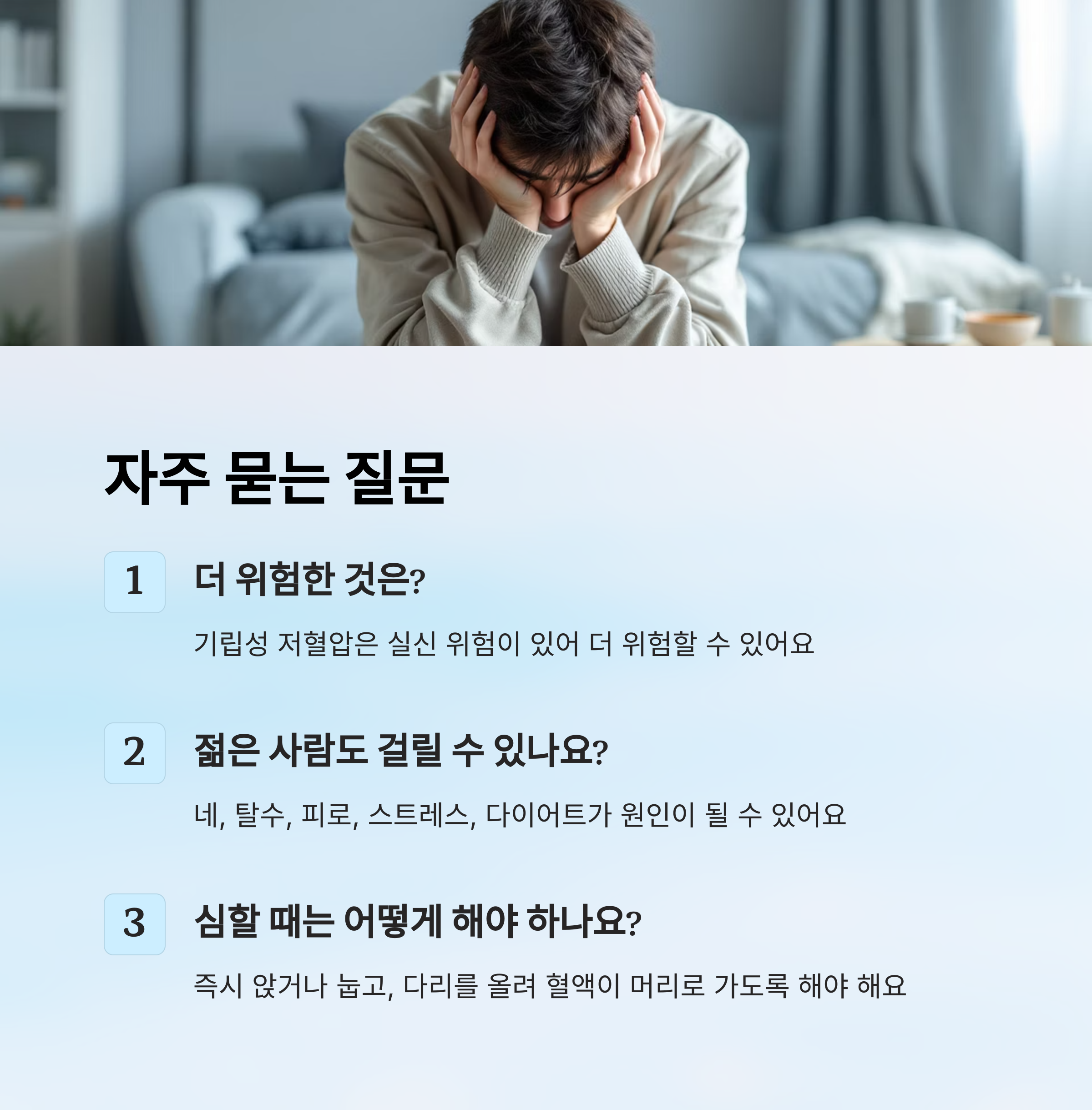 A1. 기립성 저혈압은 순간적으로 실신할 위험이 있어 더 위험할 수 있어요. 일반 저혈압은 만성 피로와 어지러움을 유발할 수 있지만, 기립성 저혈압은 갑작스러운 혈압 저하로 인해 넘어지거나 부상을 입을 가능성이 높아요.