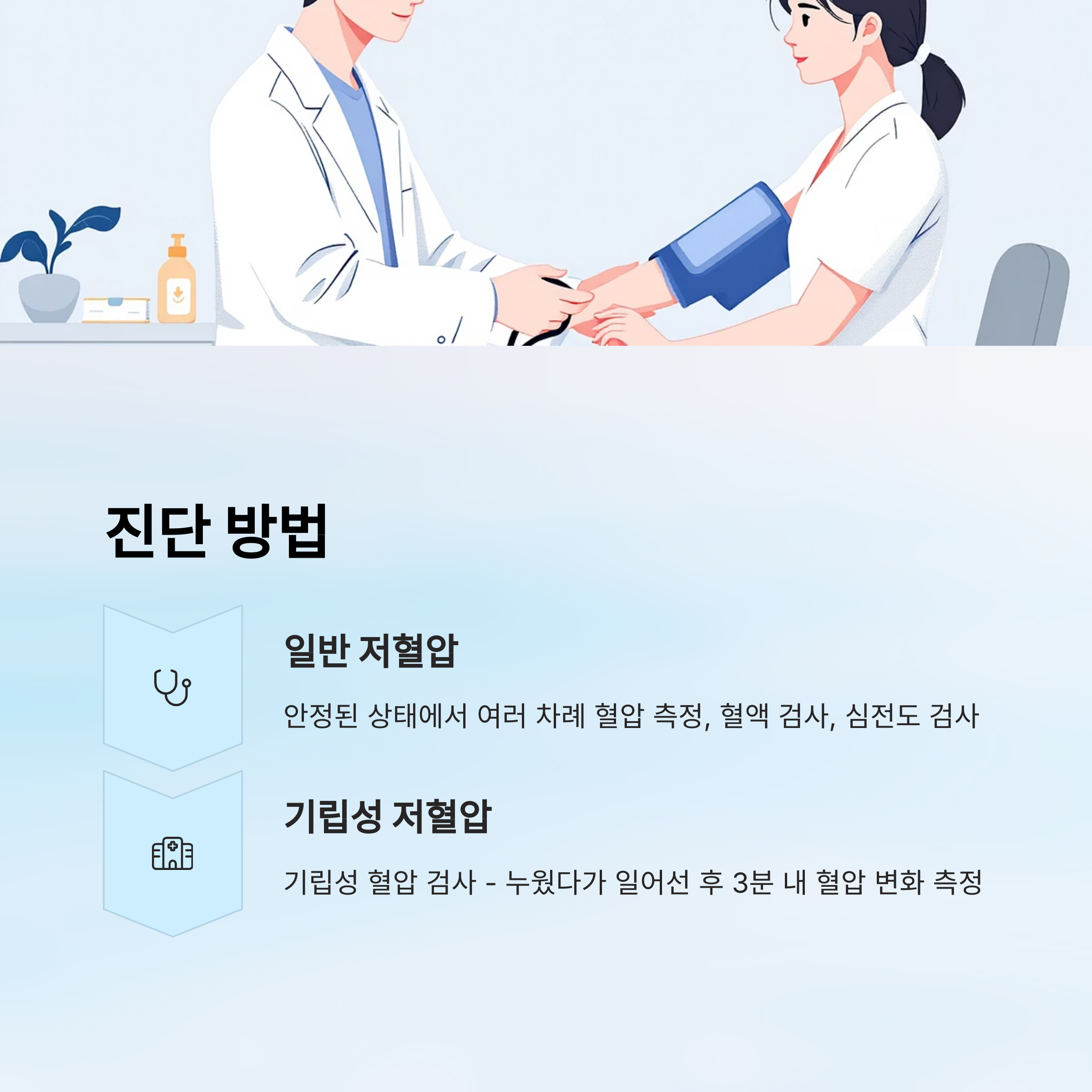 | 진단 방법 | 일반 저혈압 | 기립성 저혈압 |