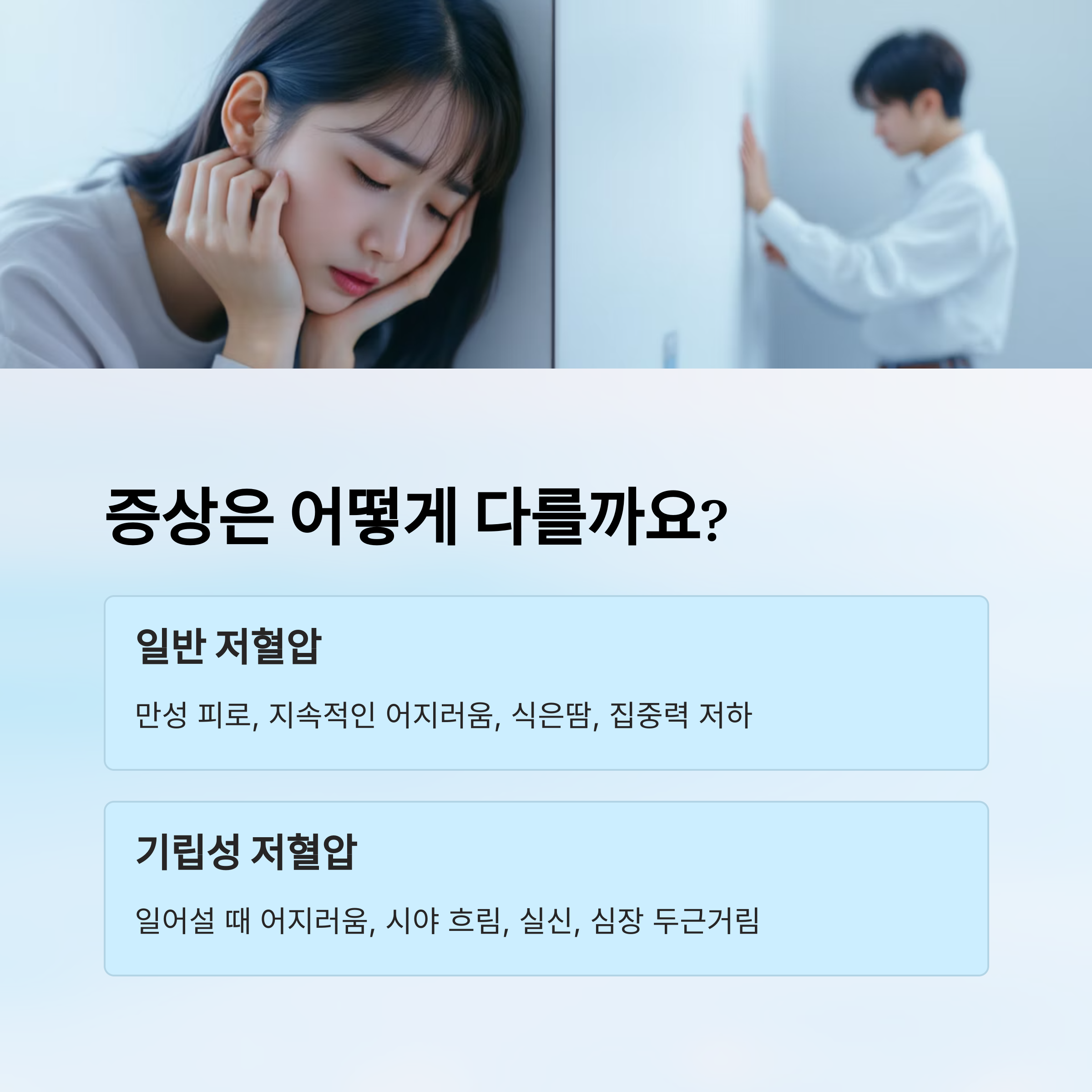 기립성 저혈압과 일반 저혈압은 모두 혈압이 정상보다 낮은 상태지만, 원인과 발생 방식이 달라요. 쉽게 말해 일반 저혈압은 혈압 자체가 지속적으로 낮은 상태라면, 기립성 저혈압은 자세 변화(예: 앉아 있다가 일어설 때)로 인해 혈압이 급격히 떨어지는 경우를 말해요.