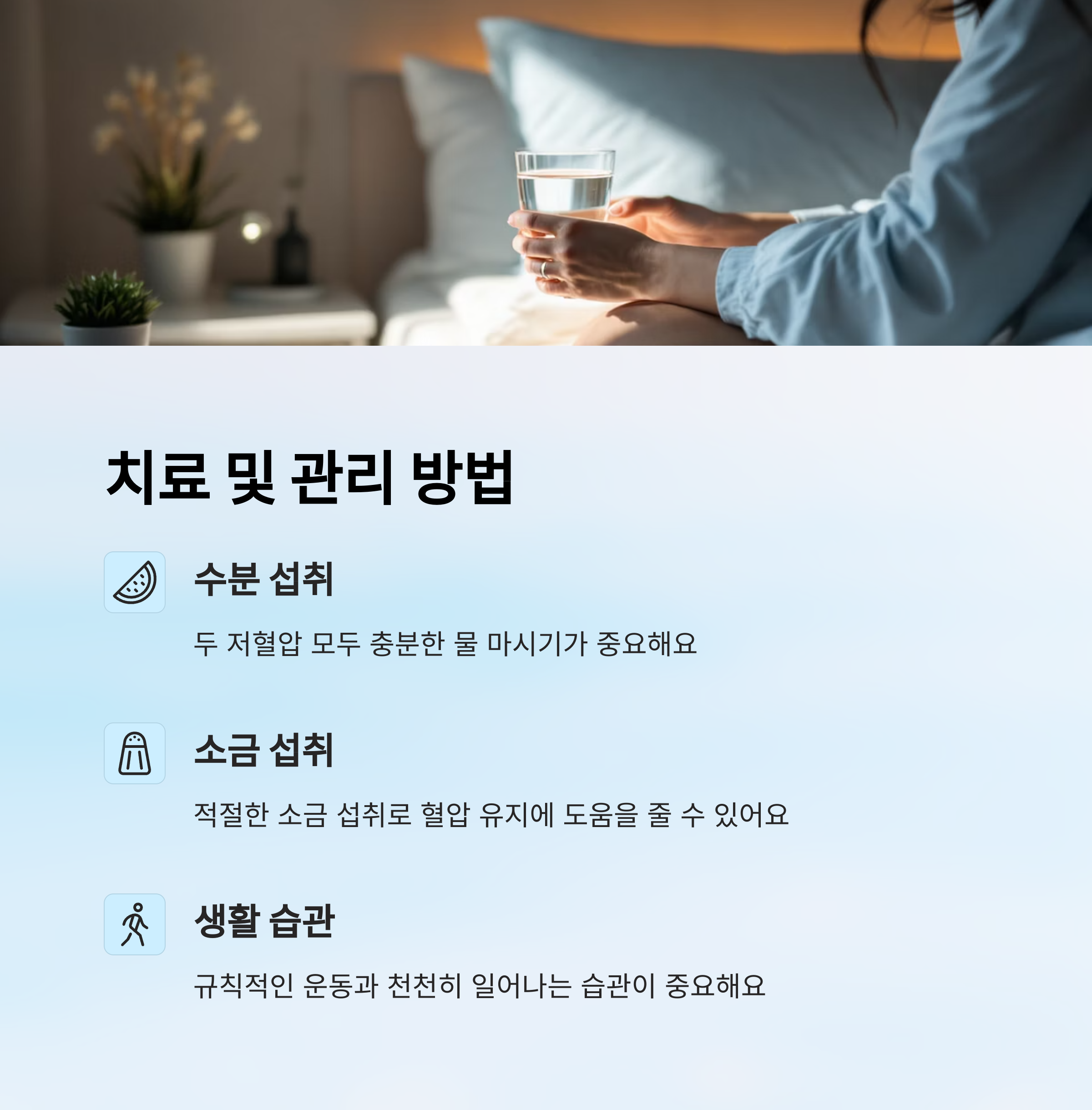 | 관리 방법 | 일반 저혈압 | 기립성 저혈압 |