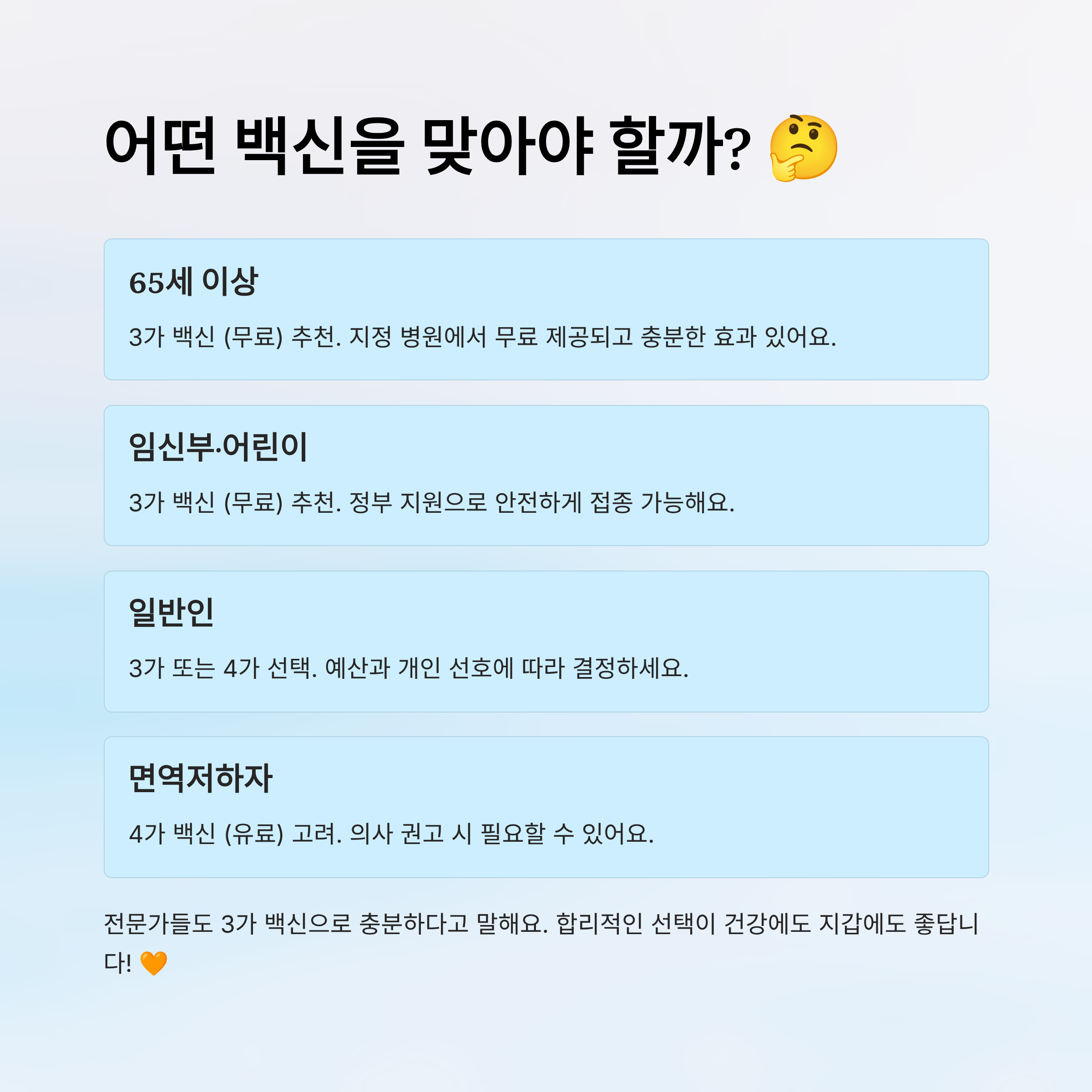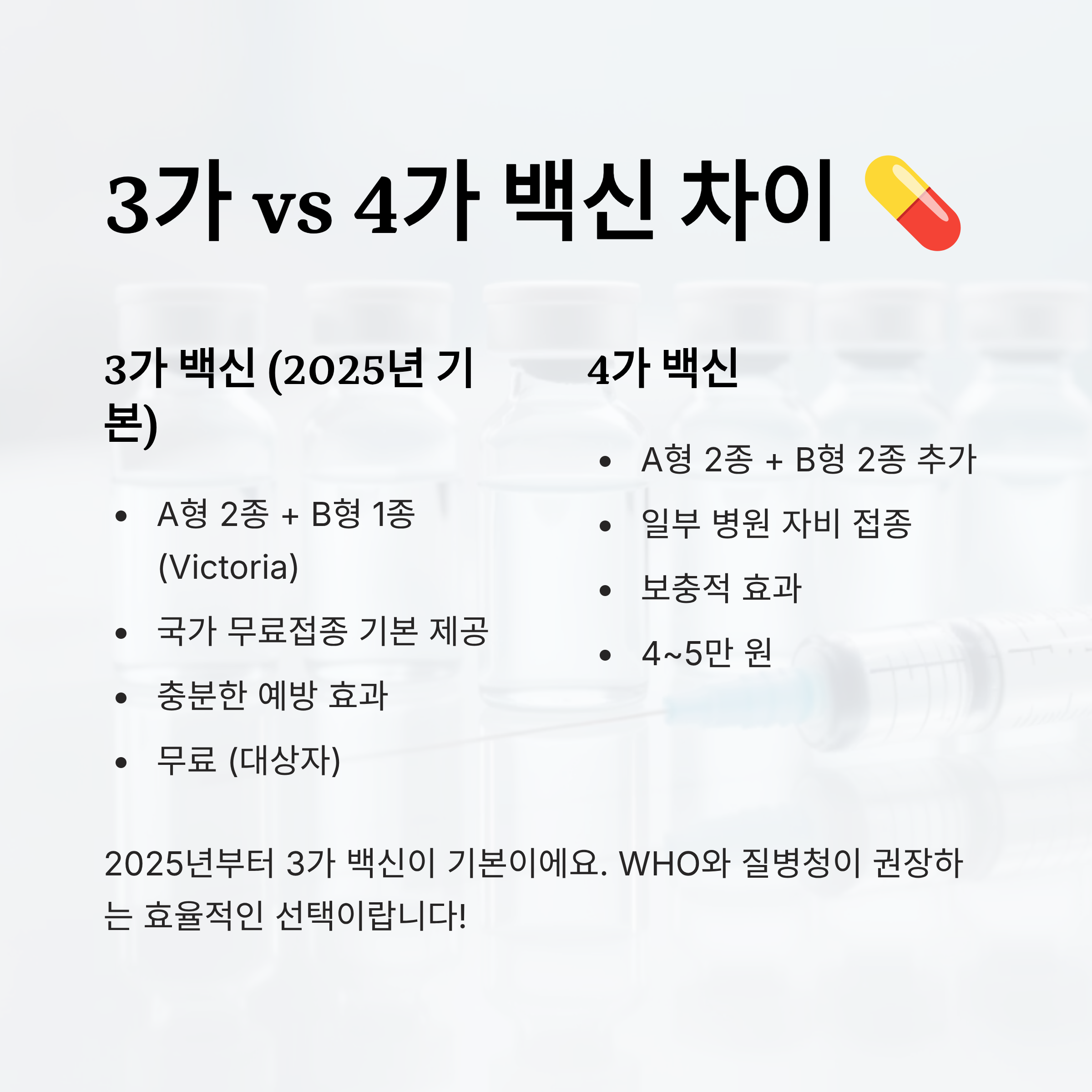 정리하자면, 2025년부터는 **3가 백신이 기본**이에요. 특별한 사유가 없다면 무료 대상자는 3가 백신으로 접종하면 충분하고요, 유료접종 예정인 분들도 비용을 줄이려면 3가를 고려해보는 게 좋아요. 👍
