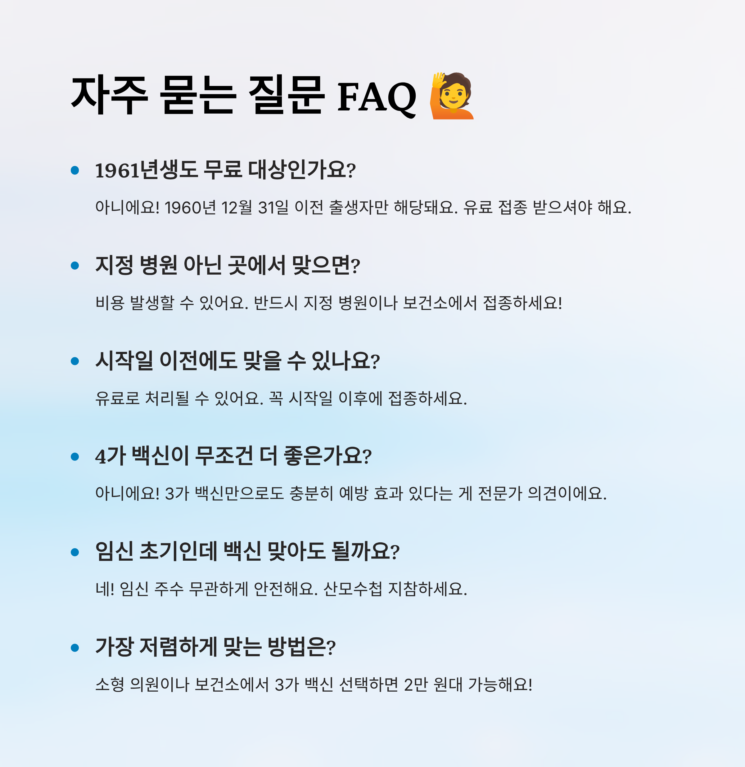 A1. 아니에요! 2025년 기준으로 무료접종 대상은 1960년 12월 31일 이전 출생자부터예요. 1961년생은 해당되지 않으므로 유료 접종을 받아야 해요.