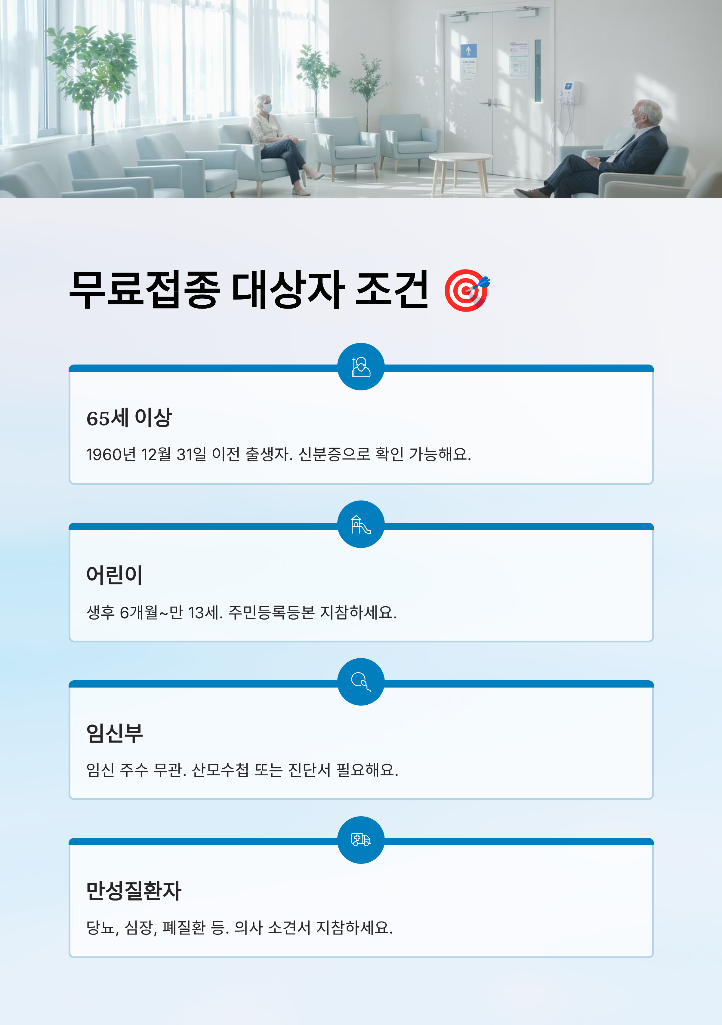 가장 먼저 나이 기준! 1960년 12월 31일 이전에 태어난 분들은 만 65세 이상으로 간주돼요. 그 외에도 어린이(생후 6개월~만 13세), 임신부, 만성질환자, 장애인 등 일부 건강 취약계층도 무료 대상자로 포함돼요. 특히 어린이와 임신부는 연령과 관계없이 의사 소견 없이도 접종 가능해요.