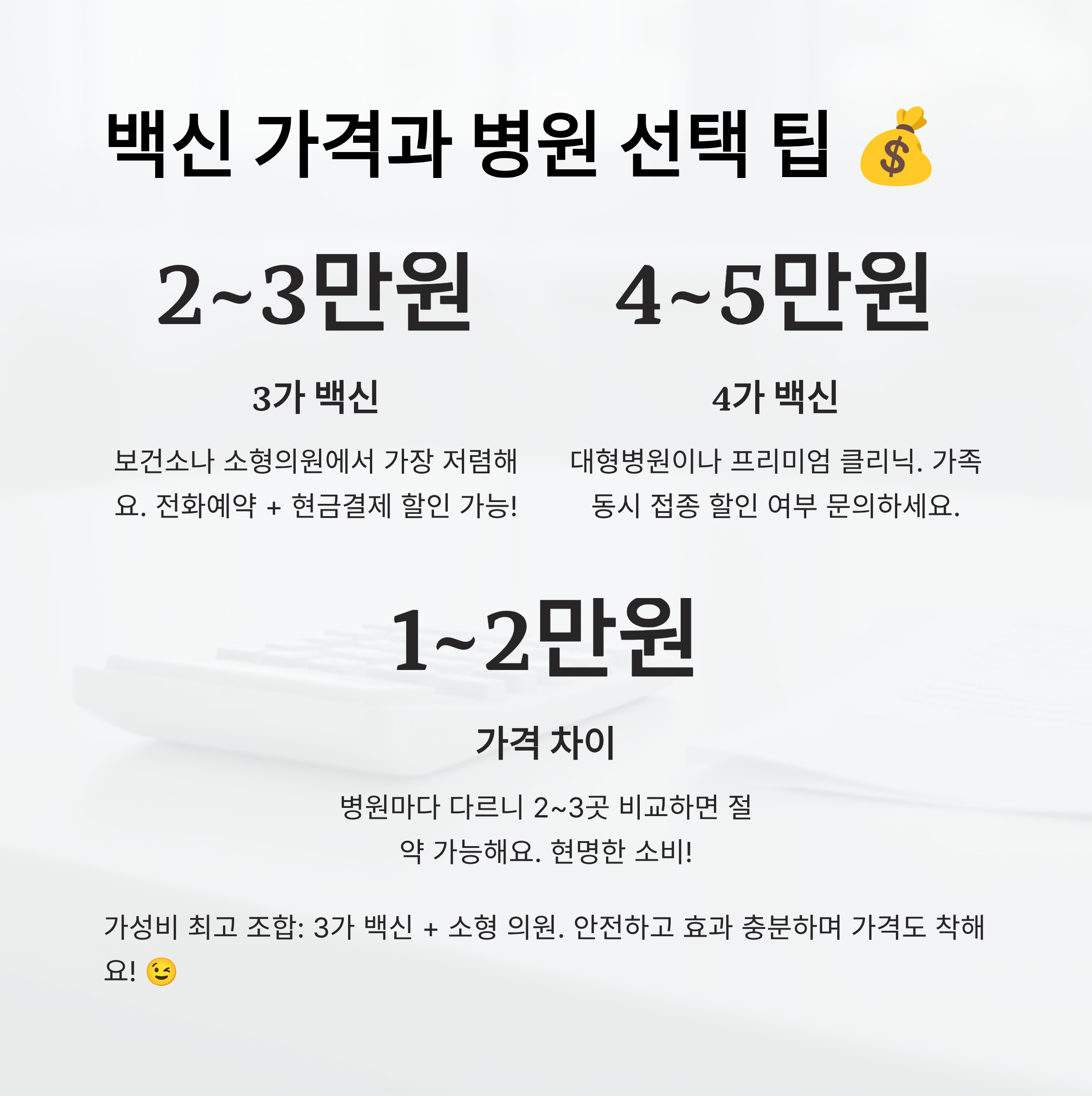 | 백신 종류 | 예상 가격 | 추천 병원 유형 | 가격 팁 |