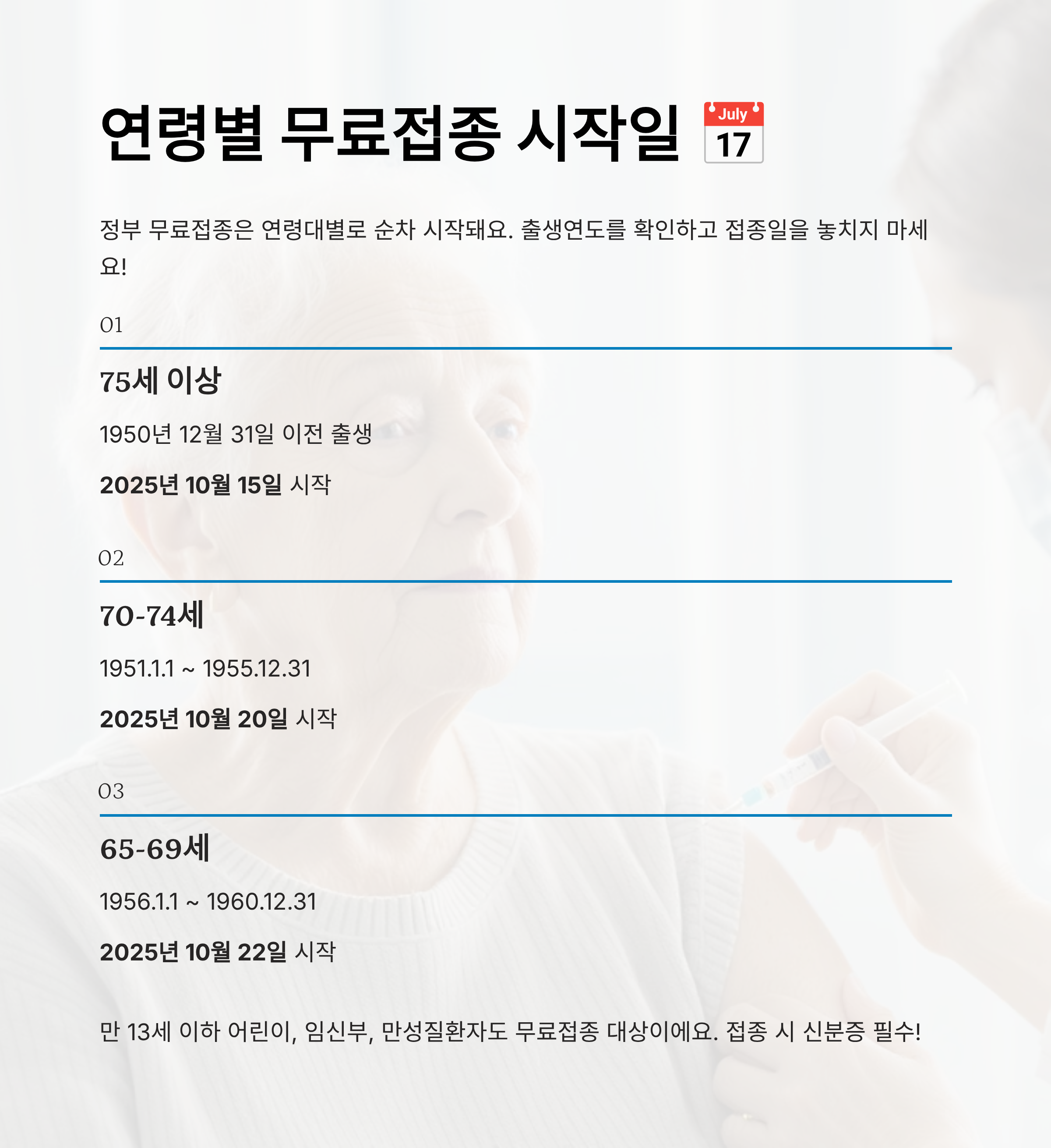 2025년 기준으로 정부에서 제공하는 독감 예방 무료접종은 연령대에 따라 일정이 다르게 적용돼요. 특히 65세 이상 어르신을 대상으로는 순차적으로 접종이 시작되기 때문에, 해당 연령대에 속하는지 먼저 확인하는 게 중요하답니다.
