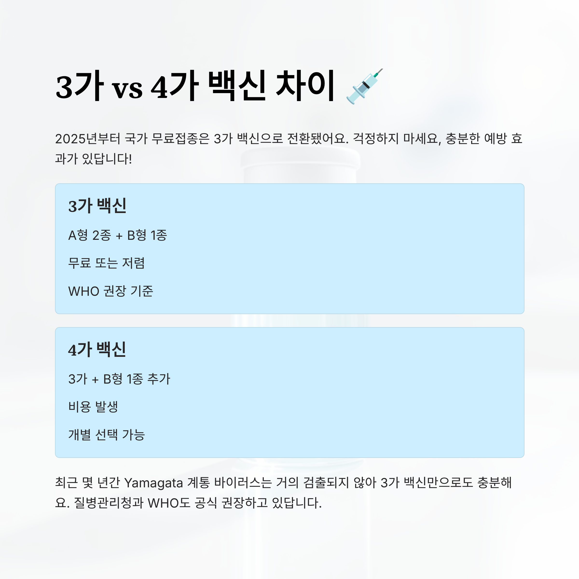 💸 비용 면에서도 3가 백신이 훨씬 경제적이고, 부작용이나 안전성 면에서도 별다른 차이는 없어요. 만약 유료로 접종해야 한다면, 병원마다 3가·4가 백신을 선택할 수 있는 경우도 있으니 상담 후 결정하시면 좋아요.