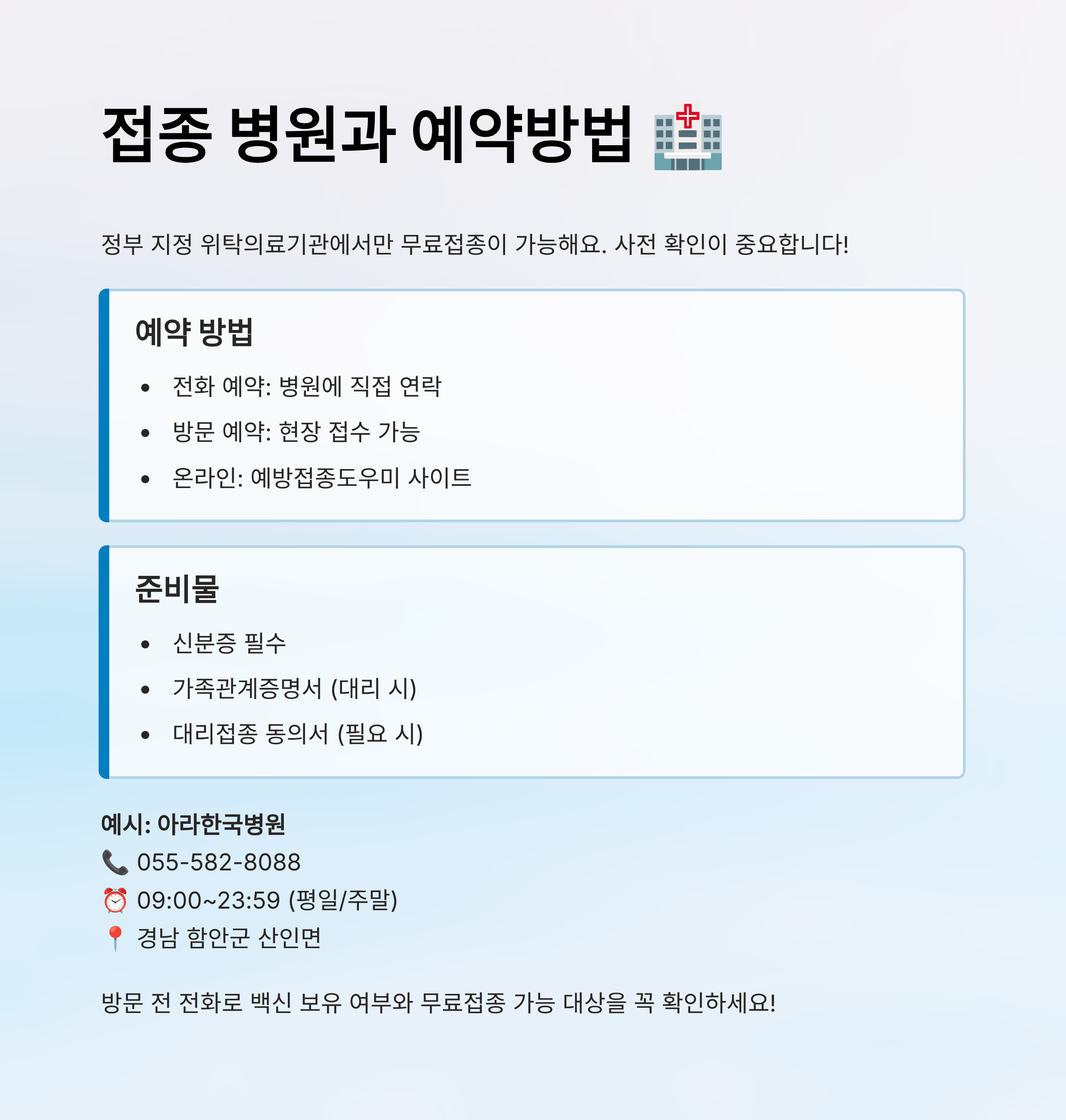 📌 접종 시에는 반드시 신분증이나 예방접종 대상 확인서류를 지참해야 해요. 병원 방문 전에는 예약 여부도 함께 체크해주세요!