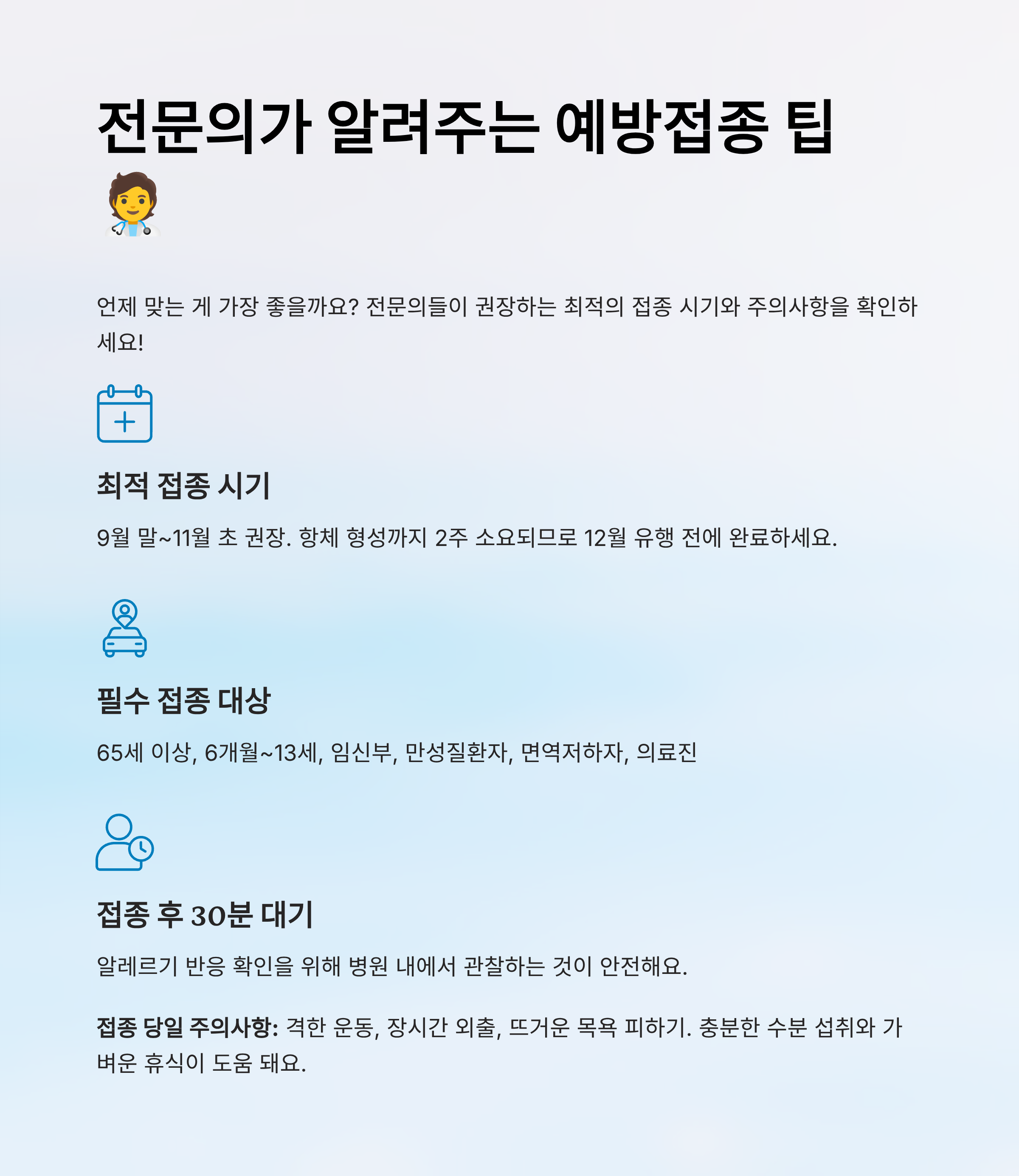 🧑⚕️ 전문가들은 특히 65세 이상, 만성질환자, 임신부 등 고위험군의 경우 빠른 시일 내 접종을 권하고 있어요. 접종 후 2주 정도면 항체가 형성되므로, 본격적인 독감 유행 전에 접종을 완료하는 게 좋아요!
